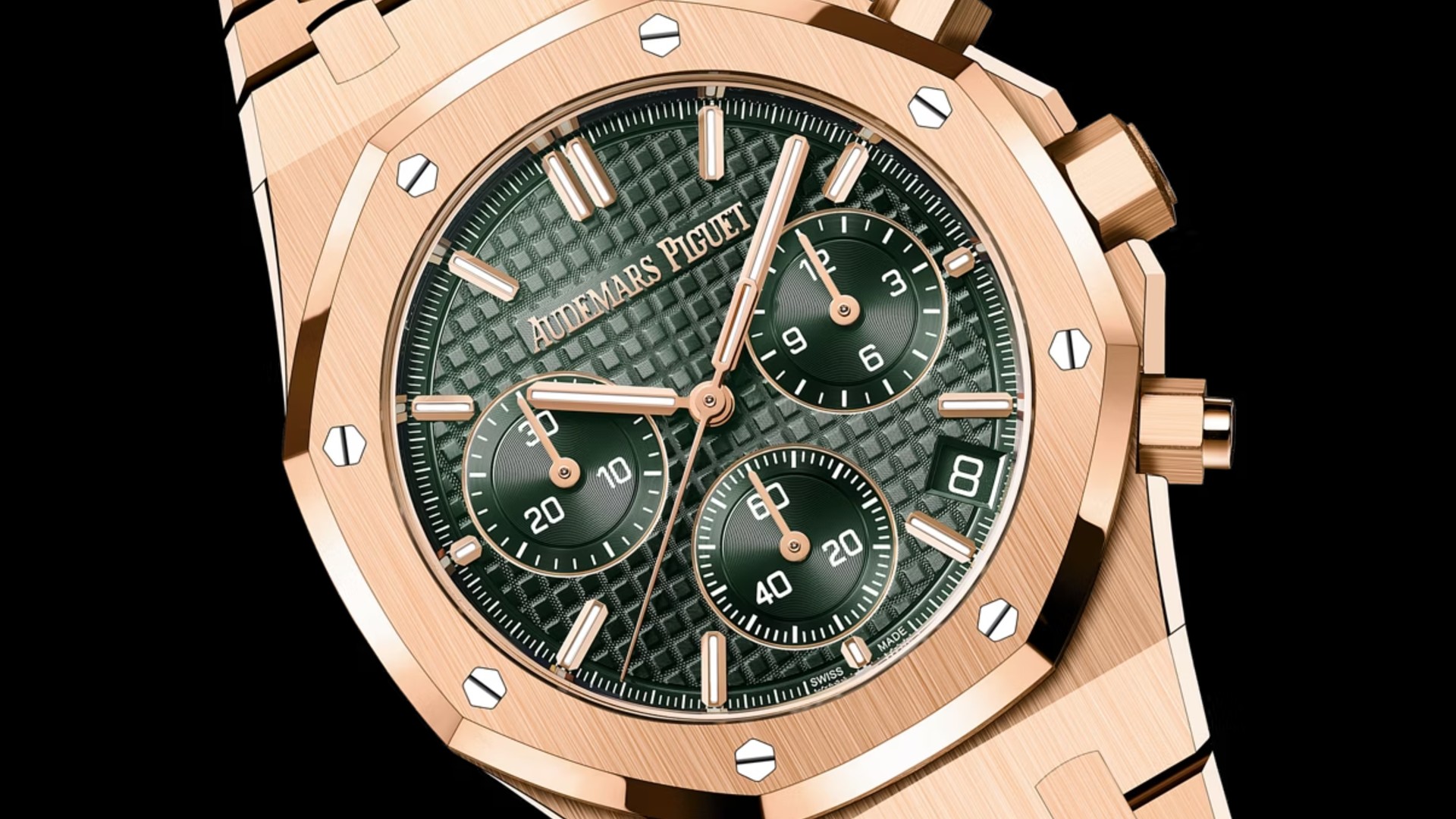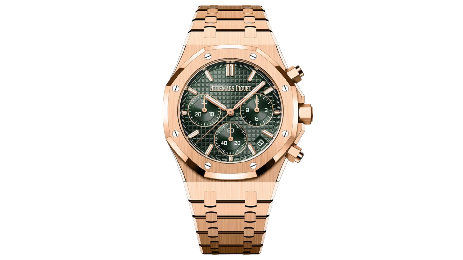 オーデマピゲの中でも、存在感とステータス性を兼ね備えたモデルとして人気を集めているのが「ロイヤルオーク クロノグラフ 26240OR.OO.1320OR.08」。ピンクゴールドのケースにグリーンダイヤルを組み合わせたラグジュアリーなデザインは、世界中の時計ファンから高い注目を集めています。