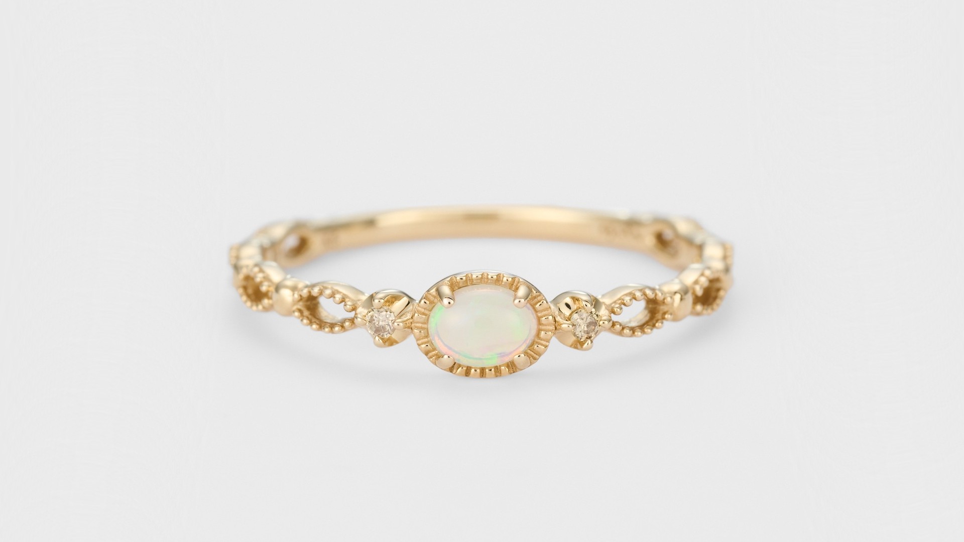 オパールの持つ幻想的な彩りとダイヤモンドの繊細なきらめきが融合したK5リングは、手元を可憐に演出する魅力的な一品です。オパールをあしらったリングは、柔らかい色合いが美しく、見る角度によって表情を変える遊色効果が楽しめます。