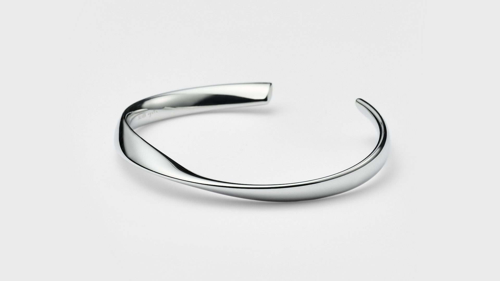 大胆なひねりを加えた、水の流れを思わせる有機的なフォルムが特徴です。熟練の技術を要する中空の線材を用いることで、大ぶりなデザインでありながらも驚くほど軽やかな着け心地を実現。素材には、美しい輝きと適度な強度を両立したsilver925が使われており、地金の艶やかな面が光を柔らかく反射し、手元を繊細かつ上品に引き立ててくれるでしょう。
