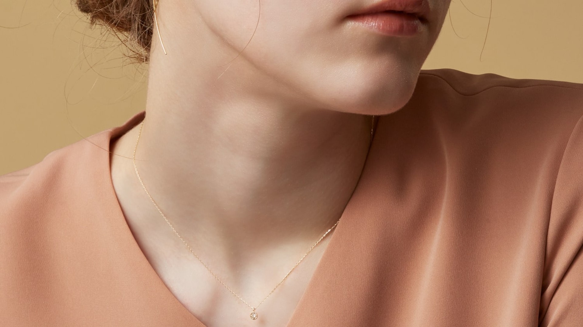 素材に使われているK10は傷がつきにくい性質を持ち、淡く優しい色合いで肌なじみが良いのが美点といえるでしょう。繊細な輝きを放つダイヤモンドを使ったネックレスは、どのような装いにも合わせやすく、重ね付けを楽しむ方にも最適なベーシックアイテムです。