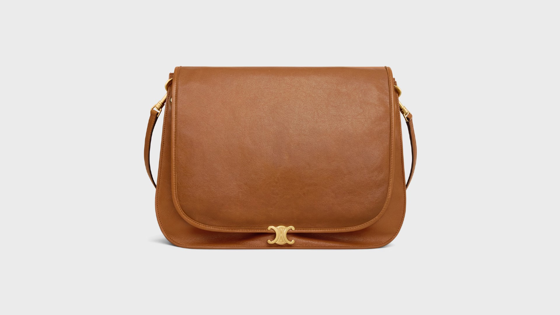 フラップの曲線が全体の印象を和らげ、硬質なイメージになりがちなレザーバッグに温かみをプラス。ゴールドのトリオンフモチーフが、柔らかなレザーの上でジュエリーのように輝き、控えめながらも確かな存在感を放ちます。
