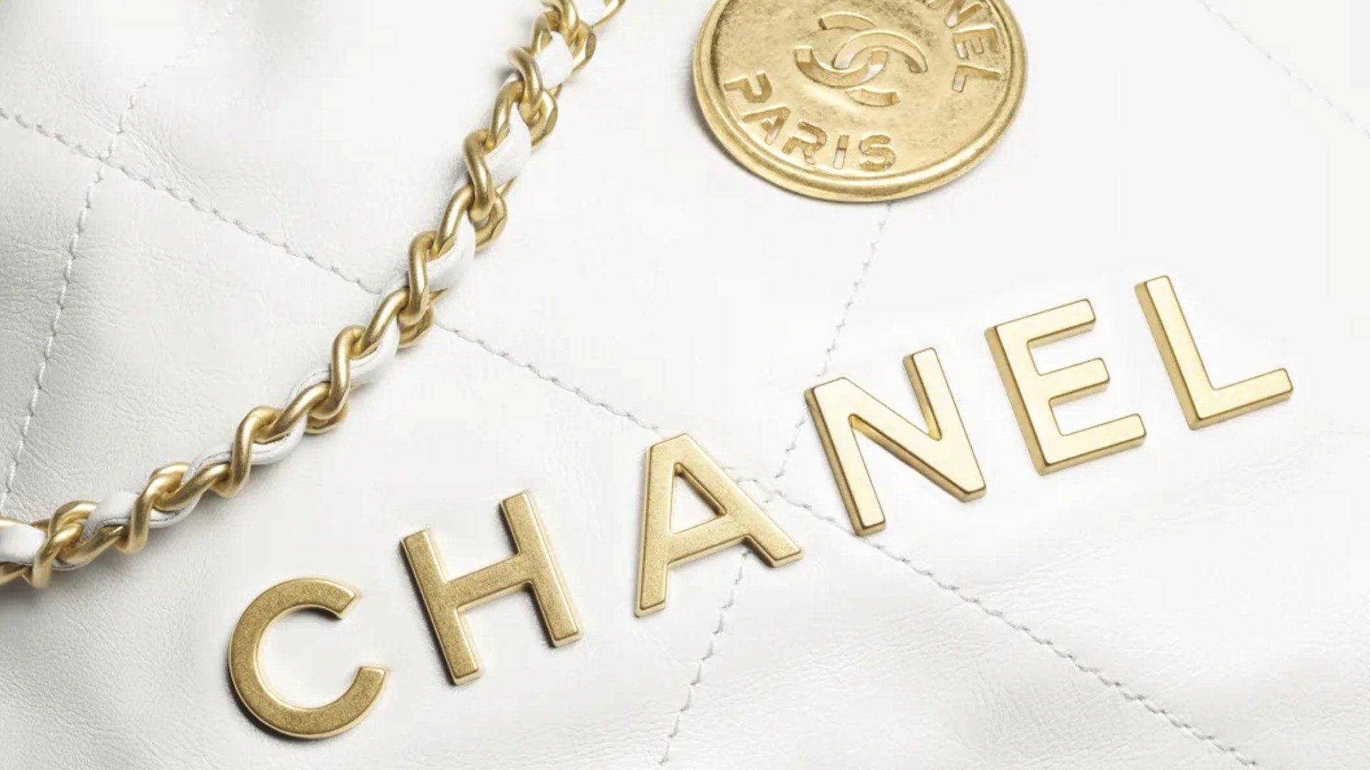 中央に大胆にあしらわれた「CHANEL」のロゴは、メタルパーツで表現され、遠目からでも確かな存在感を放ちます。単なるロゴの強調にとどまらず、自分らしさを大切にする現代女性の強さや自信を象徴するデザインと言えるでしょう。さらに、レザーを編み込んだメタルチェーンには、さりげなく「CHANEL PARIS」と刻まれたメダリオンが揺れ、歩くたびに微かな金属音とともにラグジュアリーな余韻を残します。