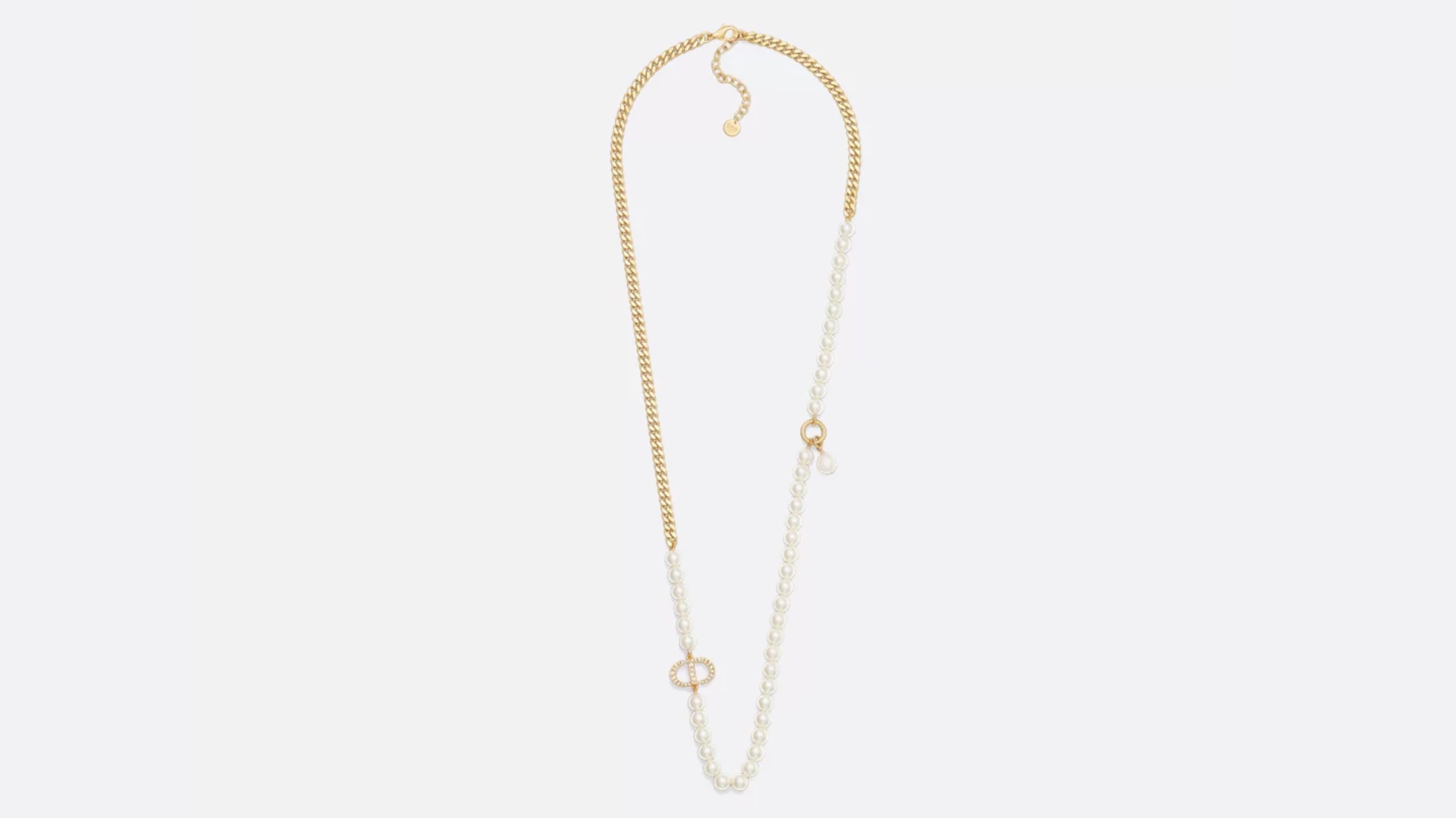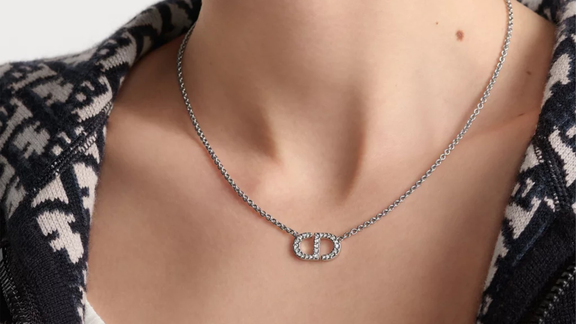 このネックレスは、シルバートーンの真鍮をベースに、ブランドのアイコニックな「Dior Oblique」モチーフをあしらった、まさにメゾンの世界観を表現した一本。両サイドにはアシンメトリーなホワイトクリスタルと、グレーのレジンで刻まれた Oblique ロゴのディテールが配されており、さりげなくも存在感のあるデザインとなっています。チェーンは長さ調整可能で、Tシャツからジャケットまで幅広くマッチ — カジュアルにもモードにも振れる、万能なネックレスです。