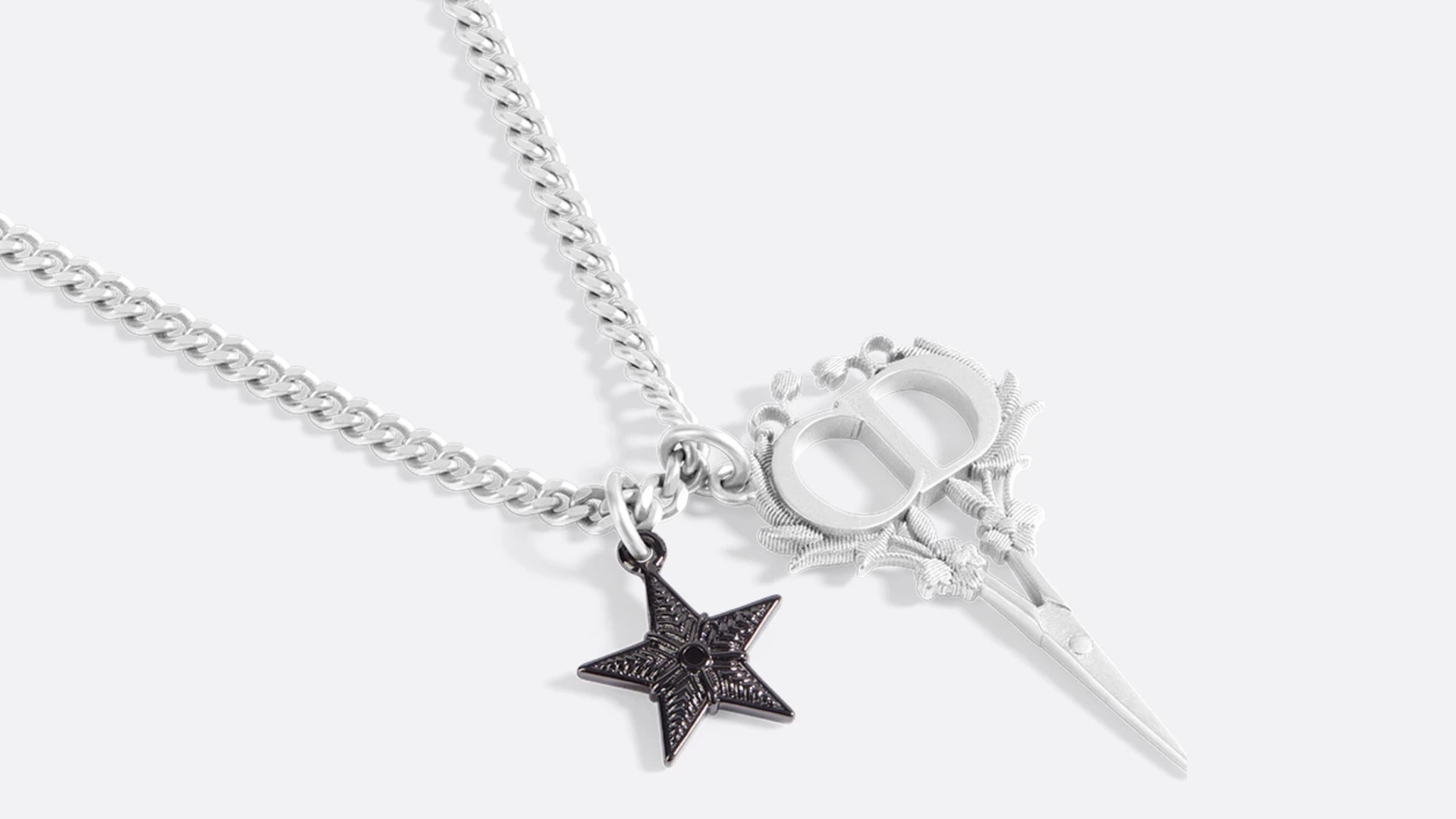 ブラックにルテニウム仕上げした真鍮製スターと、ギローシュ仕上げのフローラルモチーフをあしらった「CD Icon」付きハサミのチャームが揺れる、唯一無二のデザインが特徴です。シャツやTシャツ、レザーアウターなど様々な装いに自然と溶け込みます。シルバートーンとブラックのコントラストが放つモダンで少しダークな雰囲気は、ストリート感とエレガンスを両立 — 普段のスタイルをぐっと格上げしてくれる一本です。また、お揃いのブレスレットやリングと合わせれば統一感ある大人のコーディネートが完成します。