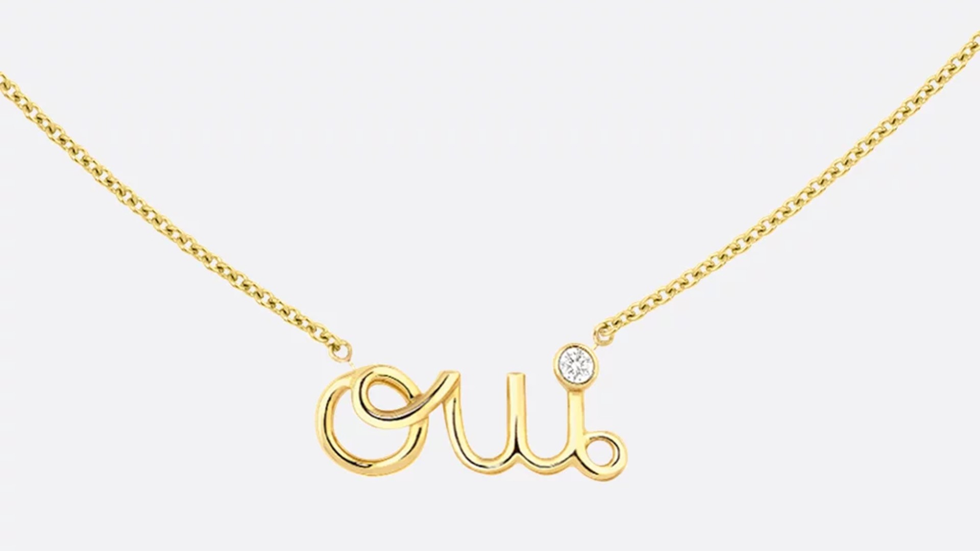 「Oui」の文字には、小さなダイヤモンド(約0.03カラット)が一粒あしらわれ、さりげない輝きが首元に上品なアクセントを添えます。チェーンはアジャスター付きで、約37.5〜40 cmの長さに調整可能 — タートルネックのインナーから、シャツの上まで、さまざまなスタイルに自然に馴染みます。