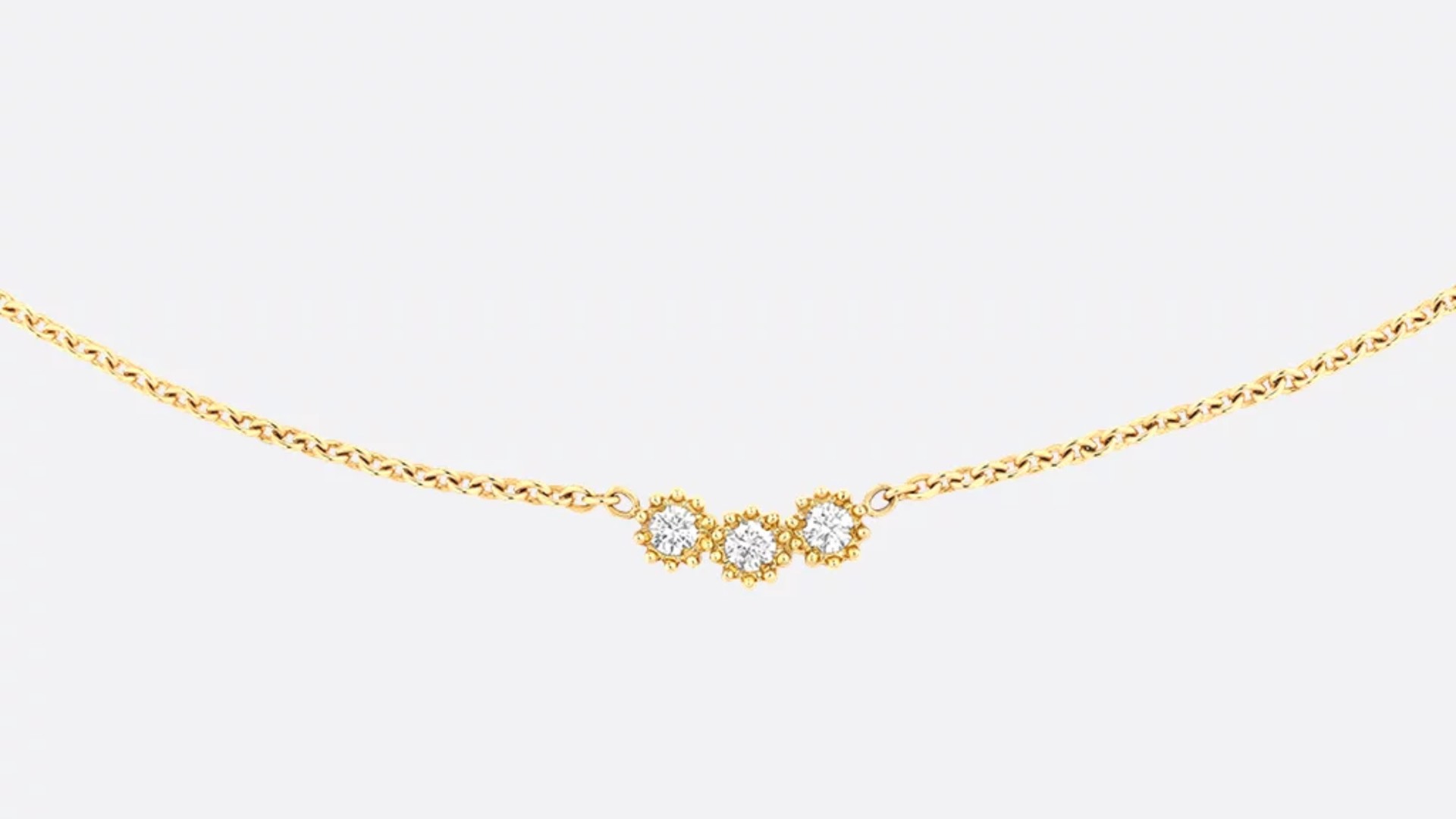 極めて華奢で繊細なチェーンと、小さなモチーフが特徴の「ミミローズ」は、その控えめなサイズ感が日本の女性の肌に美しく馴染むことから人気です。モチーフの縁には「米粒(Millet Grains)」と呼ばれる小さな装飾(ミル打ち)が施されており、ディテールにまでこだわったクチュールメゾンならではの美意識を感じさせます。