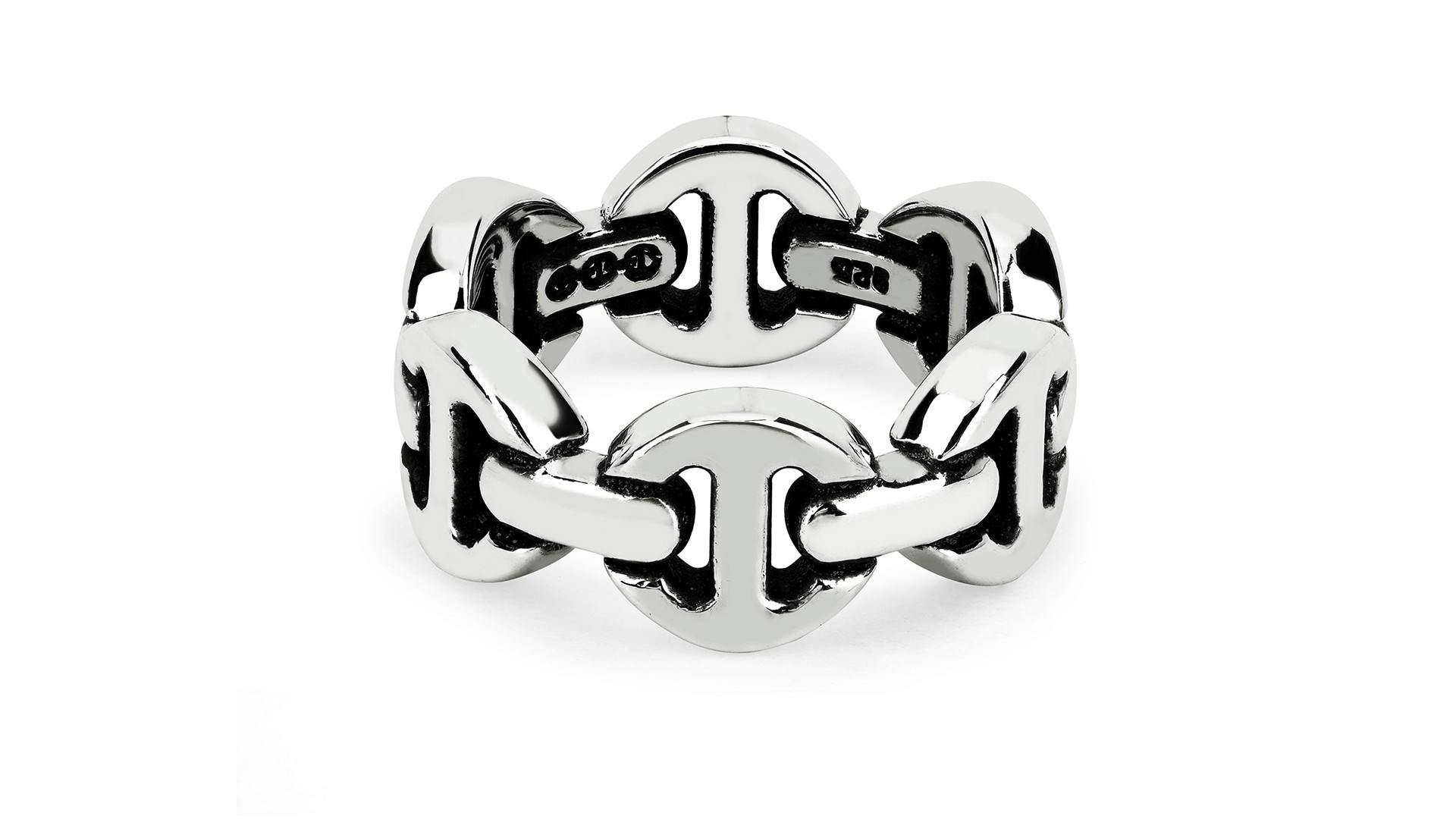 ホーセンブースのリングは、そのインパクトが魅力的です。特に「トライリンク」のデザインは一度見ると忘れられない存在感を放っています。このデザインは、古代の船のアンカーチェーンからインスパイアを受けており、力強さを感じさせるアイテムです。シンプルな服装にアクセントを加えるだけで、一気にスタイルが決まります。