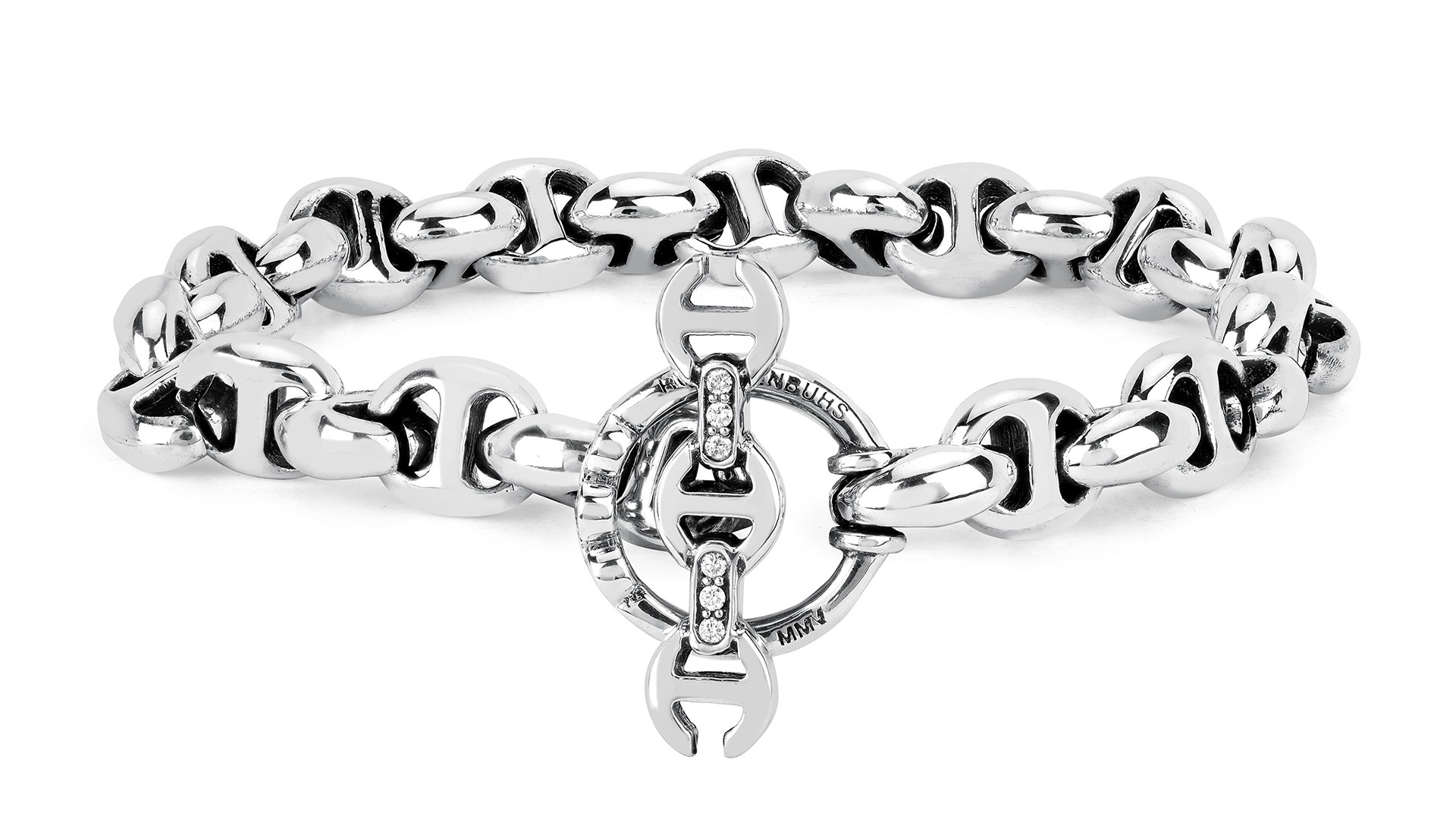 ホーセンブース(Hoorsenbuhs)は、2005年にアメリカ・ロサンゼルスでロバート・キースによって設立された高級ブランドです。ブランド名は、キースの祖先がオランダで使用していた商船の名前から来ており、歴史的な背景を持っています。特徴的なデザインは、「トライリンク」と呼ばれるモチーフで、ホーセンブースのアイコンとなっています。