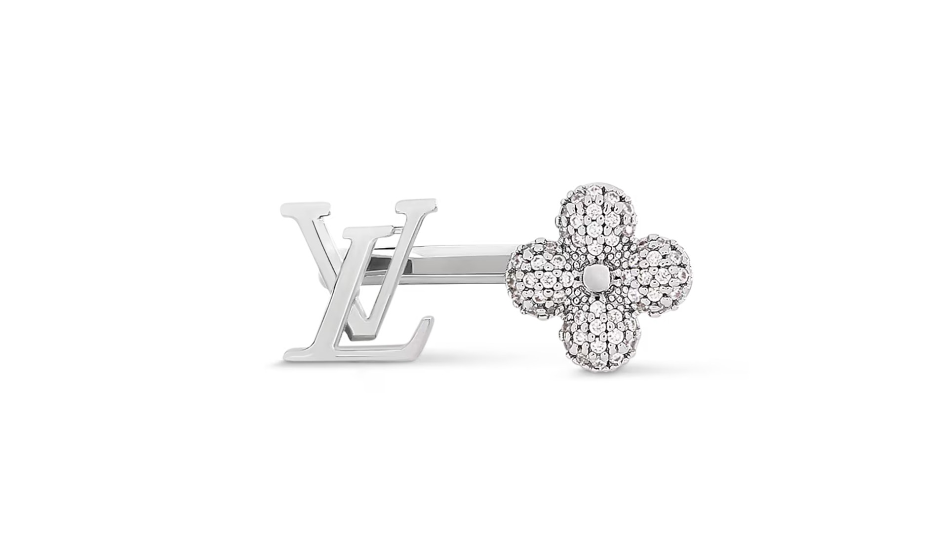 LVロゴにストラスを組み合わせた、華やかさと上品さを兼ね備えたモデルです。ジュエリーらしい存在感がありながら、派手すぎないバランスが魅力。特別な日のアクセサリーとしてはもちろん、コーディネートの格上げアイテムとしても活躍します。