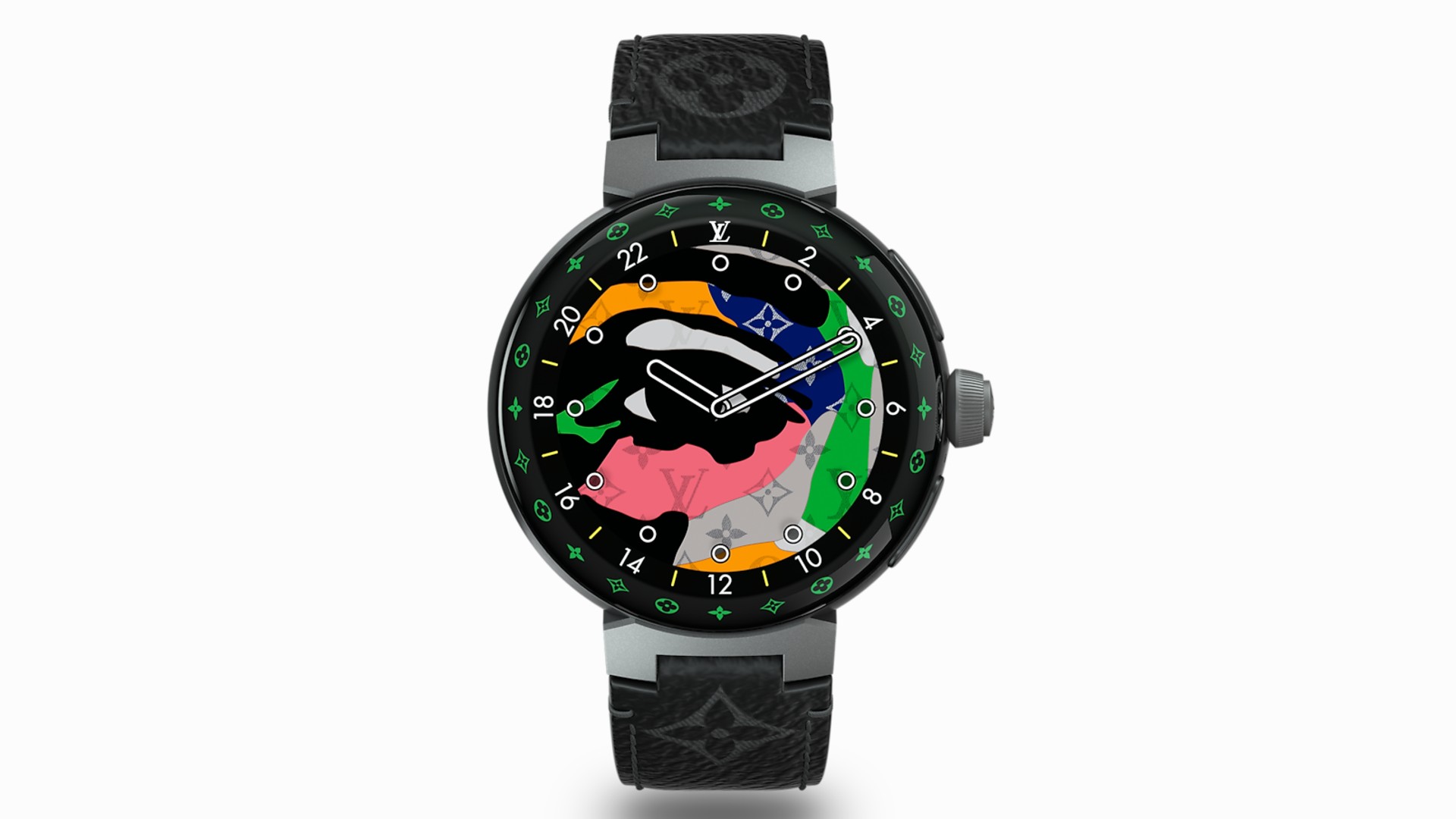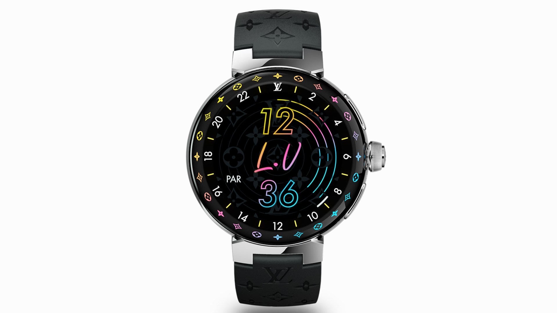 最大の特徴は、カーブしたサファイアガラスの下に配置されたLEDライトです。ウォッチの起動時や通知を受信した際には、ブランドを象徴するモノグラム・パターンが万華鏡のようにカラフルに発光し、視覚的な楽しさを演出します。