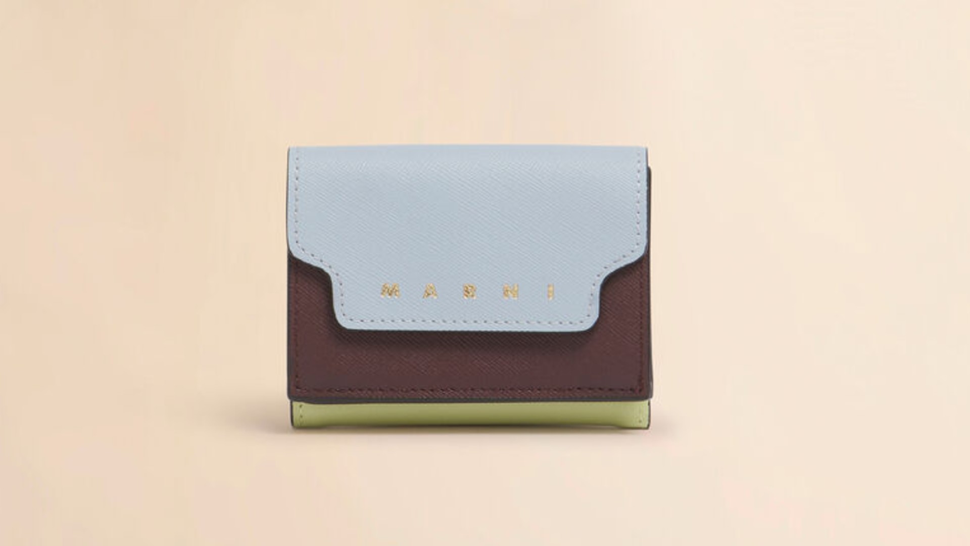 マルニならではの卓越したカラーブロッキングが目を引く、芸術品のような三つ折り財布です。ブルー、ブラウン、グリーンという3つの色が見事に調和し、他にはない独創的な存在感を放っています。