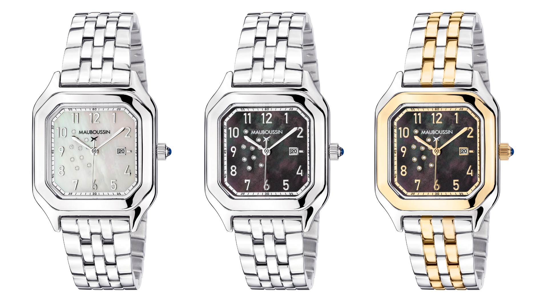 周りを囲むスクエアケースにはダイヤモンドが上品に散りばめられ、クラシカルでありながらも現代的な雰囲気を演出。時刻を確認するたびに、手元でまたたくダイヤモンドとマザーオブパールの輝きが、日常の何気ない瞬間を特別なものに変えてくれます。