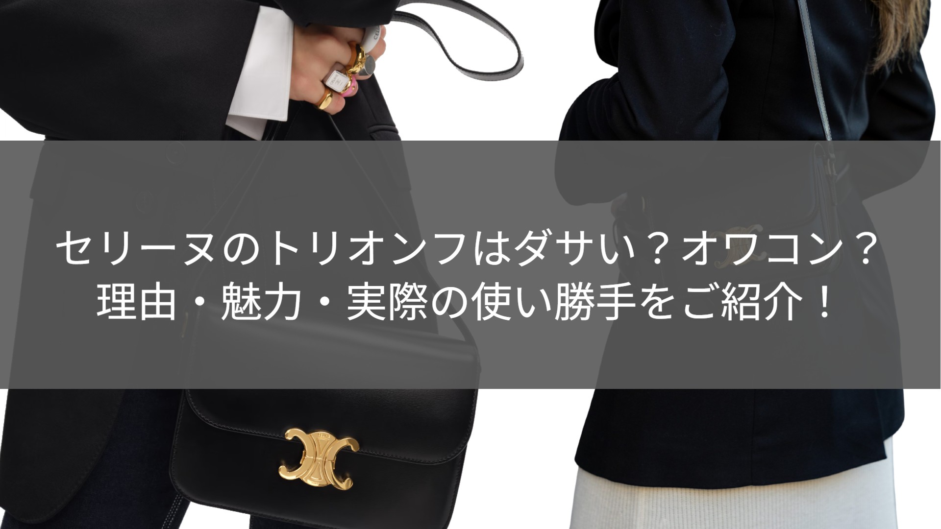 クラシカルな気品が漂うセリーヌのトリオンフ。「いつかは手に入れたい」とお考えの方もいるのではないでしょうか。しかし、購入を検討してネット検索をすると「ダサい」といったネガティブな言葉を目にしてしまい、不安を感じていませんか? この記事では、なぜトリオンフが「ダサい」と言われるのか、その理由を深掘りします。さらに、SNSの評判だけではわからない、時代を超えて長く愛される本当の魅力や、おすすめのアイテム、購入で後悔しないための注意点まで、購入前の疑問を解消する情報をまとめました!ぜひ参考にしてください。 1.そもそもセリーヌのトリオンフとは? 出典:CELINE パリの凱旋門が放つ威厳と、フランスの職人技が融合したセリーヌの「トリオンフ」。ブランドの歴史を体現するこのアイコンは、世界中の女性たちを魅了し続けています。ここではセリーヌのトリオンフについて詳しく紹介したいと思います。 1-1.凱旋門の鎖がモチーフの歴史あるアイコン トリオンフのモチーフとなっているのは、パリのエトワール凱旋門を囲んでいる「鎖」です。フランス語で「凱旋」を意味するトリオンフは、単なるロゴマークではありません。メゾンの長い歴史と、パリという街の記憶が刻まれた特別なシンボルなのです。 誕生のきっかけは、1972年に遡ります。創業者のセリーヌ・ヴィピアナが車でパリ市内を移動中、エトワール広場で不運にも車が故障してしまいました。ふと車外に目を向けたヴィピアナの視界に飛び込んできたのが、凱旋門を取り囲むチェーンの輪です。 鎖の連結部分が、偶然にもセリーヌの頭文字である「C」を2つ背中合わせにした形に見えたのです。ヴィピアナはこの偶然を運命的な出会いだと感じ、このモチーフをメゾンの象徴的なエンブレムへと育て上げました。実際にこのモチーフがコレクションで発表されたのは1979年春夏のことでした。 時を経て、2018年2月にアーティスティック・ディレクターとしてエディ・スリマンが就任します。彼はメゾンのアーカイブからこのモチーフを再発見し、自身のデビュー作となった2019年春夏コレクションで「トリオンフ」として現代的に蘇らせ、新生セリーヌの顔に据えました。 ゴールドに輝くメタルのクロージャーは、過去と現在をつなぐ架け橋のような存在です。ヴィンテージライクな雰囲気の中にも、どこか都会的で洗練された空気が漂い、手にする人の感性を刺激します。 1-2.セリーヌを象徴する人気コレクション 現在、トリオンフはバッグのみならず、財布やベルト、アクセサリーに至るまで幅広いアイテムに採用されています。コレクション全体を通して共通するのは、圧倒的な存在感とエレガンスです。 中でも代表的なアイテムといえば、やはり「トリオンフ バッグ」でしょう。滑らかな光沢を放つシャイニーカーフスキンは、指先が吸い付くような上質な触り心地を楽しめます。ゴールドカラーの金具は、まるでジュエリーのような煌めきを放ち、漆黒のレザーとのコントラストが視線を惹きつけます。 歴史的な背景を持ちながらも、常に新しい表情を見せてくれるトリオンフ。トレンドに左右されない普遍的な美しさは、これからも多くの人々にとって憧れの対象であり続けるでしょう。 2.なぜ?セリーヌのトリオンフが「ダサい」「オワコン」と言われる3つの理由 トリオンフはセリーヌを象徴するアイコンです。しかし、検索窓にネガティブな言葉が並ぶと購入を迷うこともあるでしょう。噂の背景を知れば、それが逆に人気の裏返しであると理解できます。ここでは、なぜマイナスな評価が囁かれるのか、その理由を紹介したいと思います。 2-1.ロゴの主張が強く好みが分かれるデザイン トリオンフが一部で敬遠される要因は、ロゴの圧倒的な存在感にあります。この金属パーツは、単なる留め具ではなく、まるでヴィンテージジュエリーのような輝きを放つ主役級の装飾です。シンプルなレザーバッグに大胆なアクセントを加えるデザインは、一目でブランドを認識させる力強さを持っています。 しかし、控えめなスタイルや「クワイエット・ラグジュアリー(ロゴを目立たせない装い)」を好む層からは、その主張が過剰だと受け取られる場合があるのです。 胸元や腰回りに大きなロゴが光る様子は、見る人によっては「ブランドアピールが激しい」と映ることも否定できません。 2-2.SNSでの流行過熱による量産型のイメージ 2つ目の理由は、ソーシャルメディアでの露出増加による「既視感」が挙げられます。InstagramやTikTokでは、国内外のインフルエンサーがトリオンフを身につけた投稿が数多く見られます。 特に日本では、ベージュやホワイトを基調とした淡色コーディネートを好む女性たちの間で高い人気を集め、SNS上で同じバッグの投稿が目立つようになりました。多くの人が同じアイテムを持っているという光景は、「量産型」といった印象につながることがあります。 本来、ラグジュアリーブランド