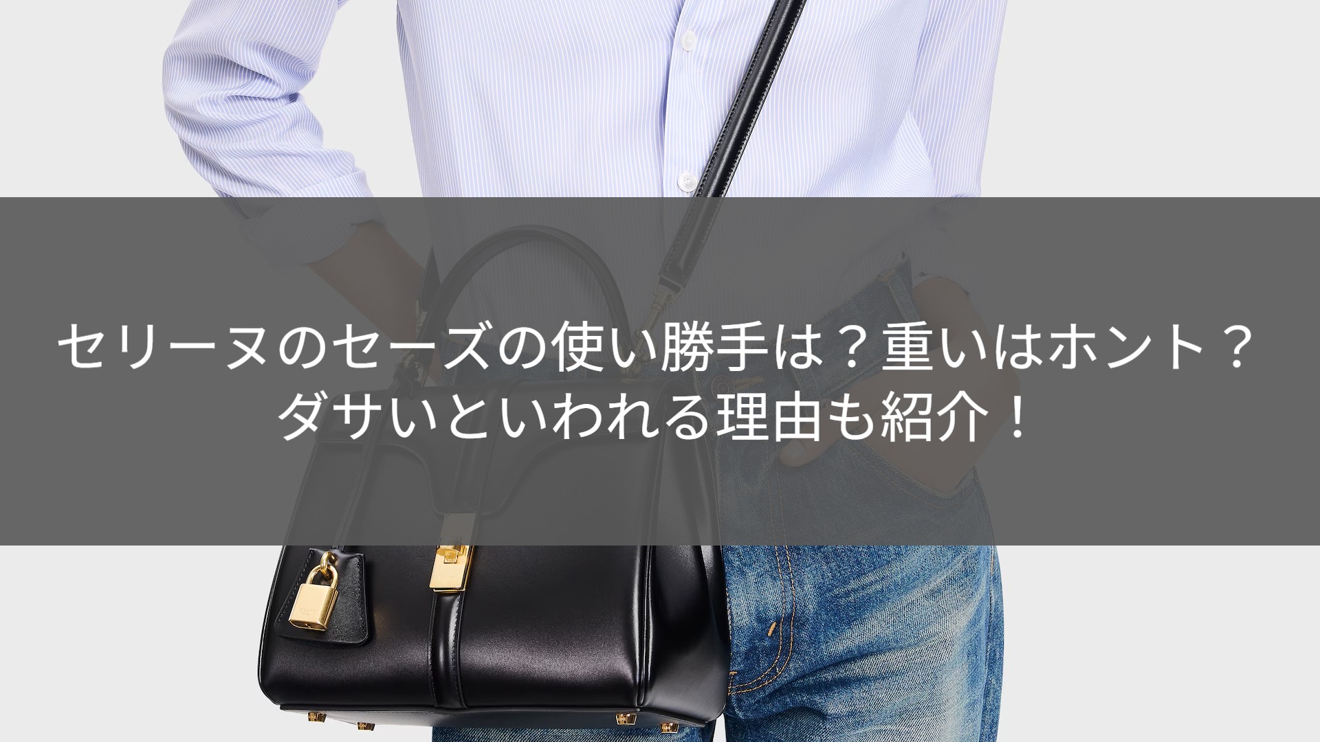セリーヌの新たなアイコンとして人気を誇る「セーズ」。そのクラシカルで洗練された佇まいに、「いつかは手に入れたい一生モノ」として憧れを抱いている方も多いのではないでしょうか。 しかし、いざ購入を検討し始めると、「バッグ自体が重くて疲れないか」「繊細な革はすぐに傷がつかないか」といった、デザイン性だけでは判断できない“リアルな使い心地”が気になりますよね。 本記事では、セーズのサイズ別収納力の比較から、素材による傷への耐久性、独特なターンロックの操作感まで、購入前に知っておきたい実用面を解説します。さらに、荷物量に合わせた「後悔しない選び方」や愛用芸能人情報もまとめました!購入を検討している方には参考になる内容となっておりますので、ぜひご覧ください! 1.購入前に知りたい!セーズのリアルな使い勝手 セリーヌの伝統と革新が融合した「セーズ」は、持つだけで背筋が伸びるような美しい佇まいが魅力です。決して安い買い物ではないからこそ、購入前に使い心地や丈夫さをきちんと知っておきたいと感じる方も多いでしょう。 ここでは、リアルな使い勝手を詳しく紹介したいと思います! 1-1.バッグが重いかはサイズと素材次第 憧れのバッグを手にする際、誰もが気にするのが「重さ」ではないでしょうか。結論から言うと、選ぶモデルによって感じる重量感は大きく異なります。人気の「ミニ」や「スモール」サイズはおおよそ500~600g程度のようです。 実際、セリーヌのセーズに限らず、レザーを使用したバッグはある程度の重さがあるものです。ただ、その重さを「負担」と感じるかどうかは、人それぞれです。普段からレザーバッグを使い慣れている方であれば、特別重いと感じることは少ないでしょうし、むしろしっかりとしたつくりによる安心感や高級感として受け取る方も多いはずです。 また、セーズは持ったときのバランスが良く、実際の重量以上に軽やかに感じやすい点も魅力のひとつ。数字だけで判断するより、ライフスタイルや使い方に合うかどうかを重視しましょう。 1-2.ターンロックの開閉は慣れれば簡単 セーズの顔とも言えるのが、フラップ中央に輝くゴールドのターンロック金具です。クラシカルな美しさを演出する一方で、「開け閉めが面倒ではないか」と心配されることもあります。確かに、ファスナーやマグネット式に比べると、一つの動作が必要になる点は否めません。 しかし、この金具の操作は非常にシンプルです。金具のつまみを指で持ち、回転させるだけでロックが解除されます。使い始めは金具の位置を確認する必要があるかもしれませんが、慣れるにつれて指先の感覚でスムーズに扱えるようになるでしょう。 むしろ、バッグを閉じるたびに響く「カチッ」という小さな金属音は、中身をしっかり守っている合図のように聞こえ、心地よささえ感じられます。財布を取り出し、再びロックをかける一連の所作が、あわただしい日常の中に優雅なリズムを生み出します。 慣れてしまえば手間ではなく、セーズを持つ喜びを確認する大切な儀式へと変わっていくでしょう。 2.【なぜ人気?】セリーヌのセーズが一生モノと呼ばれる理由 出典:CELINE セリーヌの歴史に新たな息吹を吹き込んだ傑作「セーズ」は、登場以来、世界中の女性たちを魅了し続けています。単なるバッグではなく、日常をアップグレードしてくれるパートナーのような存在です。 ここでは、セーズが一生モノと呼ばれる理由を紹介したいと思います。 2-1.流行り廃りのないクラシカルデザイン セーズが時代に左右されない理由は、セリーヌの1960年代のアーカイブバッグから着想を得た、クラシカルなデザインだからです。 アーティスティック・ディレクターだったエディ・スリマンが就任初日にデザインに着手し、完成まで半年以上を要したとされるこのバッグは、パリにあるメゾンのアトリエの住所「ヴィヴィエンヌ通り16番地」に由来します。 過去のアーカイブから着想を得た、特徴的なクロップド・フラップや、丸みを帯びたベルトのディテールが、構築的なシルエットに柔らかな印象を与えているのが特徴です。トレンチコートを羽織ったパリジェンヌが街角を歩く姿を想起させるような佇まいは、カジュアルな装いから特別な夜の装いまで、あらゆるシーンに寄り添います。 一過性のトレンドを追うのではなく、自分のスタイルを確立したい女性にとって、これ以上ない選択肢となります。過去と現在が共存するデザインは、10年後もクローゼットの主役であり続けるでしょう。 2-2.ロゴが控えめで、様々なシーンに対応可能 セーズはブランドの品格を静かに表現するバッグです。フロントのターンロック金具には「CELINE」の文字が小さく刻まれており、ブランドロゴを大きく主張しない奥ゆかしいデザインが特徴です。 このような控えめなデザインは、ビジネスシーンや華やかなお祝いの席など、コーディネートに上品さを加えたい場面で