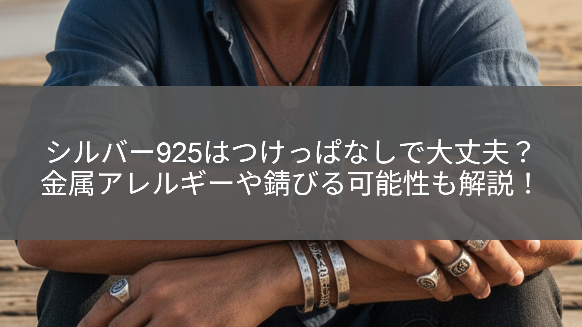 シルバー925のアクセサリー、「つけっぱなしにしても大丈夫かな?」と迷ったことはありませんか?指輪やネックレスは毎日身につけたいものですが、お風呂や寝るときに外すのは正直ちょっと面倒ですよね。でも、「錆びたり黒ずんだりしないの?」「金属アレルギーは大丈夫?」と不安に思う方も多いはずです。 実はシルバー925は、強度や価格のバランスが良く人気のある素材ですが、扱い方によっては黒ずみや肌トラブルの原因になることもあります。この記事では、シルバー925をつけっぱなしにしたときに起こることや、正しいお手入れ方法、知っておきたいメリットとデメリットを解説。 シルバー925をもっと安心して楽しむための参考になると思いますので、ぜひ参考にしていただければ幸いです。 1.シルバー925はつけっぱなしでも大丈夫? シルバー925のアクセサリーをつけていると、「お風呂や寝るときも外さなくていいの?」と気になる人も多いでしょう。結論からいうと、つけっぱなしでも大丈夫ですが、基本的には外すのがおすすめです。シルバー925は空気中の硫黄や汗、水道水の塩素などと反応して黒ずみやすく、特に温泉やプールでは変色が一気に進んでしまいます。 とはいえ、シルバー925は鉄のように錆びることはなく、黒ずんでも専用クロスで磨けば輝きは戻ります。普段の生活で多少つけっぱなしにする程度なら大きな問題にはなりません。「少しくらい黒ずんでも手入れすればいい」と割り切れる人なら、つけっぱなしで楽しむのもアリです。 ただし注意したいのが金属アレルギー。シルバー925には銅やニッケルが含まれる場合があり、肌に長時間触れることでかゆみや赤みが出る可能性があります。敏感肌の人は特に、つけっぱなしは避けた方が安心です。自分の体質と相談しながら、上手にシルバー925と付き合っていきましょう。 2.そもそも「シルバー925」とは? つけっぱなしにすると黒ずみや変色のリスクがあるとわかったシルバー925ですが、実際にどんな素材なのか詳しく理解している人は意外と少ないです。 ここでは、シルバー925の基本的な定義と、アクセサリーに必ず刻まれている刻印について解説していきます。 2-1.銀が92.5%含まれた銀合金 シルバー925とは、その名の通り銀を92.5%含んだ合金のことです。残りの7.5%には銅やニッケルなどの金属が使われており、これを「割金(わりがね)」と呼びます。純銀(SV1000)は柔らかすぎて傷や変形に弱いため、実際のアクセサリーにはあまり向いていません。そこで銅などを混ぜることで強度を高め、普段使いできる素材に仕上げているのです。 つまり、シルバー925は「見た目の美しさ」と「日常的な使いやすさ」を両立させた銀合金といえます。 2-2.刻印の種類 アクセサリーには必ずといっていいほど素材を示す刻印が入っています。シルバー925の場合、「925」「SV925」「SILVER925」といった刻印が代表的です。これらはすべて「銀を92.5%含んでいる」という意味を持ち、国内外のブランドで幅広く使われています。海外製品では「STERLING(スターリング)」と刻まれていることもあり、これもシルバーを指す表記です。刻印は素材の証明であると同時に、本物かどうかを見分ける大事なポイントにもなります。 ちなみに、シルバーの刻印には「1000(純銀)」や「900(90%銀を含む)」といった数字が使われることもあります。数字が大きいほど銀の含有率が高いことを意味しますが、そのぶん柔らかく変形しやすいため、実際のアクセサリーには925が最もバランスが良いとされています。 3.シルバー925の特徴 シルバー925は、見た目の美しさと実用性を兼ね備えていることから、ジュエリーやアクセサリーに幅広く使われています。 ここでは、そんなシルバー925が持つ代表的な特徴を3つご紹介していきます。 3-1.変色しやすいが輝きを戻せる シルバー925は空気中の硫黄や汗、皮脂に反応しやすく、黒ずみが出やすいのが特徴です。これは錆びではなく「硫化」と呼ばれる自然な反応であり、シルバーなら避けられないものです。ただし、専用クロスで磨いたりクリーナーで洗浄すれば、もとの美しい輝きを取り戻すことができます。つまり、変色はデメリットであると同時に、お手入れ次第でリカバーできるという点も大きな特徴です。 3-2.強度があり日常使いに最適 純銀は柔らかすぎて傷がつきやすいため、アクセサリーにはあまり向きません。その点、シルバー925は銅などを混ぜた合金のため強度が高く、日常生活でも安心して使えます。指輪やネックレス、ブレスレットなど幅広いアイテムに採用されるのは、このバランスの良さが理由です。 3-3.手頃な価格で楽しめる シルバー925は金やプラチナに比べて価格が抑えられており、気軽に購入しやすい素材です。高級ブランドでも採用されていますが、比較的リーズナブルに楽しめるため、ファッションに合わせて複数のデザインをそろえたい人にも人気があります。 この章にて紹介したように、シルバー925には素材