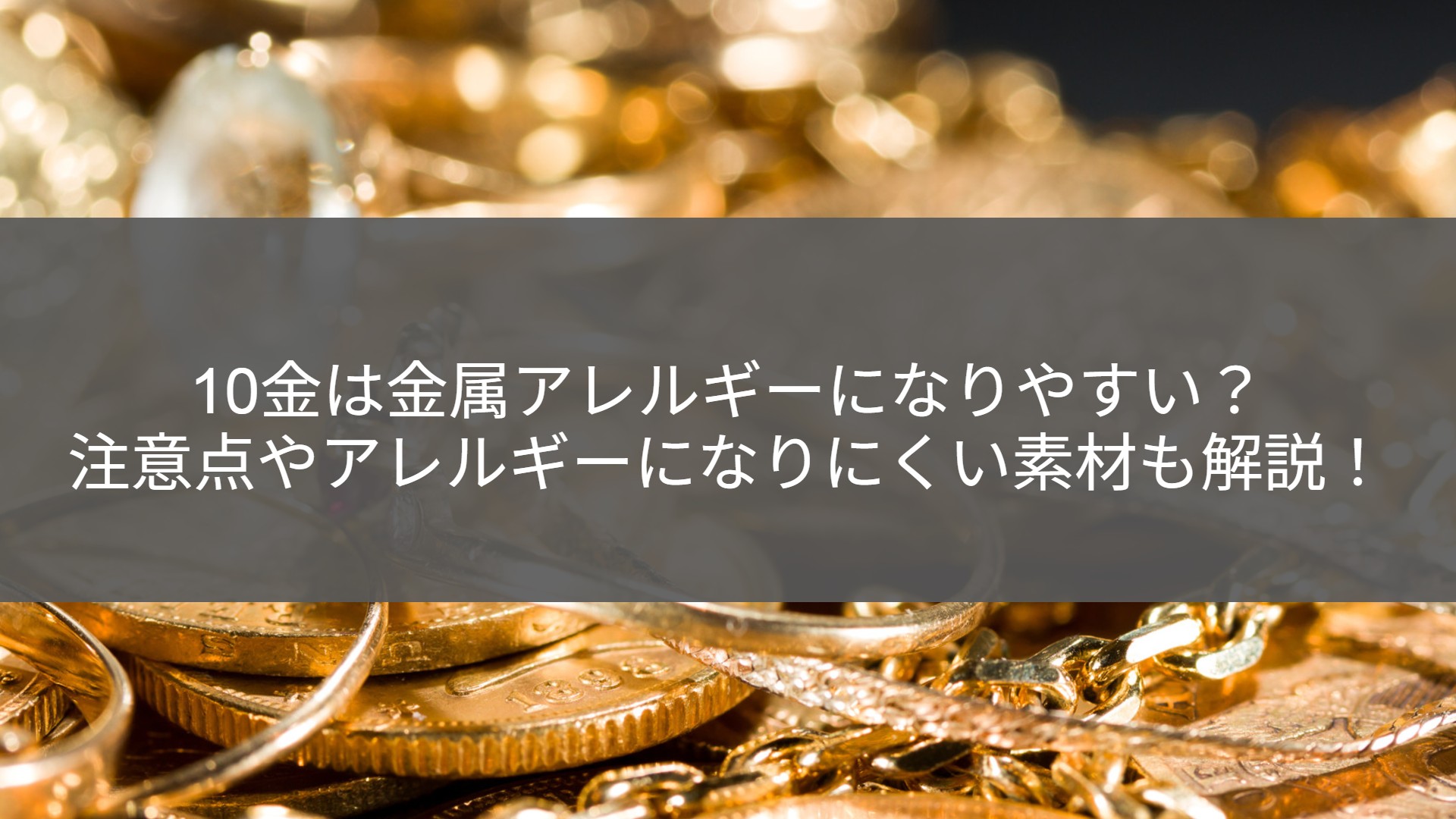 アクセサリーやジュエリーに使われる「金」の中でも、10金(K10)は人気が高まっている素材のひとつです。比較的価格が手頃で、デザインの幅も広く、普段使いのアイテムとして多くのブランドが取り入れています。 しかし、毎日つけたいアイテムだからこそ「金属アレルギー」のリスクを心配する方も多いのではないでしょうか? そこで今回は、10金のアレルギーのリスクをはじめ、素材の特徴や金属アレルギーになりやすい素材、なりにくい素材をまとめてみました!不要になった10金アイテムを高く売るコツや買取相場も解説していきますので、是非最後までご覧ください! 1.10金(K10)とはどんな素材? 10金(K10、10K)は、金の純度が24分の10、つまり約42%の純金を含む合金のことをいいます。残りの約58%には、銀や銅、パラジウムなどの金属が混ぜられています。これらを「割金(わりがね)」と呼び、金に強度や色の変化を与えるために使われています。金はとても柔らかい素材のため、そのままでは傷がつきやすく、ジュエリーとして使うには不向きです。そのため、割金を加えることで耐久性を高め、普段使いしやすい素材に仕上げています。 K10の「K(カラット)」は金の純度を示す単位で、ドイツ語の「Karat」が由来です。ダイヤモンドなどの重さを表す英語の“carat”とは意味が異なります。金の純度は24分率で表され、純金を24Kとしたとき、10Kは金が10/24含まれているという意味になります。海外では1000分率で表記されることもあり、「416」や「417」と刻印されている場合もありますが、いずれもK10(10金)と同じ純度です。 かつてはK18やK24のジュエリーが主流でしたが、金の価格が高騰したことで、より手頃な10金が注目されるようになりました。半分以下の純度だからといって価値が低いわけではなく、最近では多くのブランドがK10ジュエリーを展開しています。上品な輝きを持ちながら、日常でも気軽に楽しめる――そんなバランスの良さこそ、10金が近年注目されている理由の1つです。 2.10金(K10)の特徴 10金(K10)は、強度や色味、価格のバランスが取れた素材として多くのジュエリーに採用されています。K18やK24に比べて金の純度は低いものの、日常生活で使いやすい実用性が魅力です。 ここでは、K10が持つ3つの代表的な特徴を紹介します。 2-1.硬くて傷がつきにくい 10金は金以外の金属を多く含むため、純金や18金に比べて硬く丈夫です。純金は非常に柔らかく、少しの衝撃でも変形してしまうことがありますが、K10は割金の割合が多いことで耐久性が高まり、日常的に使用しても傷や凹みが起こりにくいのが特徴です。 リングやネックレスなど、肌に直接触れるアイテムは特に摩耗しやすいですが、K10なら安心して使えます。硬さがあることで細かいデザインや繊細な彫刻加工にも向いており、長くきれいな状態を保ちやすい素材です。毎日身につけるアクセサリーとしても扱いやすく、実用性と美しさを両立できる点が大きな魅力です。 2-2.K18より淡くて落ち着いた色合い 金の含有量が少ないK10は、K18よりも色味が淡く、やや落ち着いた印象になります。派手すぎず上品な輝きで、肌なじみが良いのが特徴です。 強すぎないゴールドカラーは、カジュアルにもフォーマルにも合わせやすく、どんな装いにも自然に溶け込みます。K18の華やかさと比べると控えめですが、その穏やかな色合いがかえって上品さを引き立ててくれるでしょう。普段使いはもちろん、オフィスシーンでも違和感なく着用できる点が、多くの人に支持される理由です。 2-3.価格が手頃で普段使いしやすい 10金は金の含有量が少ないため、K18やK24よりも価格を抑えやすい素材です。高価すぎない価格帯でありながら、見た目はしっかりと金の輝きを感じられるため、コストパフォーマンスに優れています。 ジュエリー初心者の方や、日常使いのアクセサリーを探している方に人気が高いのも納得です。また、価格が抑えられていることで複数のアイテムを揃えやすく、デザインの選択肢が広がります。シンプルなピアスから華奢なリングまで、幅広いスタイルに対応できる点も魅力です。手に取りやすい価格と上品な見た目を兼ね備えたK10は、日常に取り入れやすい素材として多くの人に選ばれています。 この章にてご紹介したように、K10は強度・色味・価格のバランスに優れた非常に実用的な素材です。ただし、金以外の金属を多く含むため、肌質によっては金属アレルギーを起こす場合もあります。次の章では、10金と金属アレルギーの関係について詳しく見ていきましょう。 3.10金(K10)は金属アレルギーでも大丈夫?敏感肌は知っておきたい注意点 10金(K10)は丈夫で扱いやすく、デザイン性の高いジュエリーに多く使われていますが、肌が弱い人や金属アレルギー体質の方にとっては少し注意が必要です。K10は金以外の金属を多く含むため、人によってはアレルギー反応が出てしまう場合もあります。 ここでは、なぜアレルギーが起こるのか、そして安心し