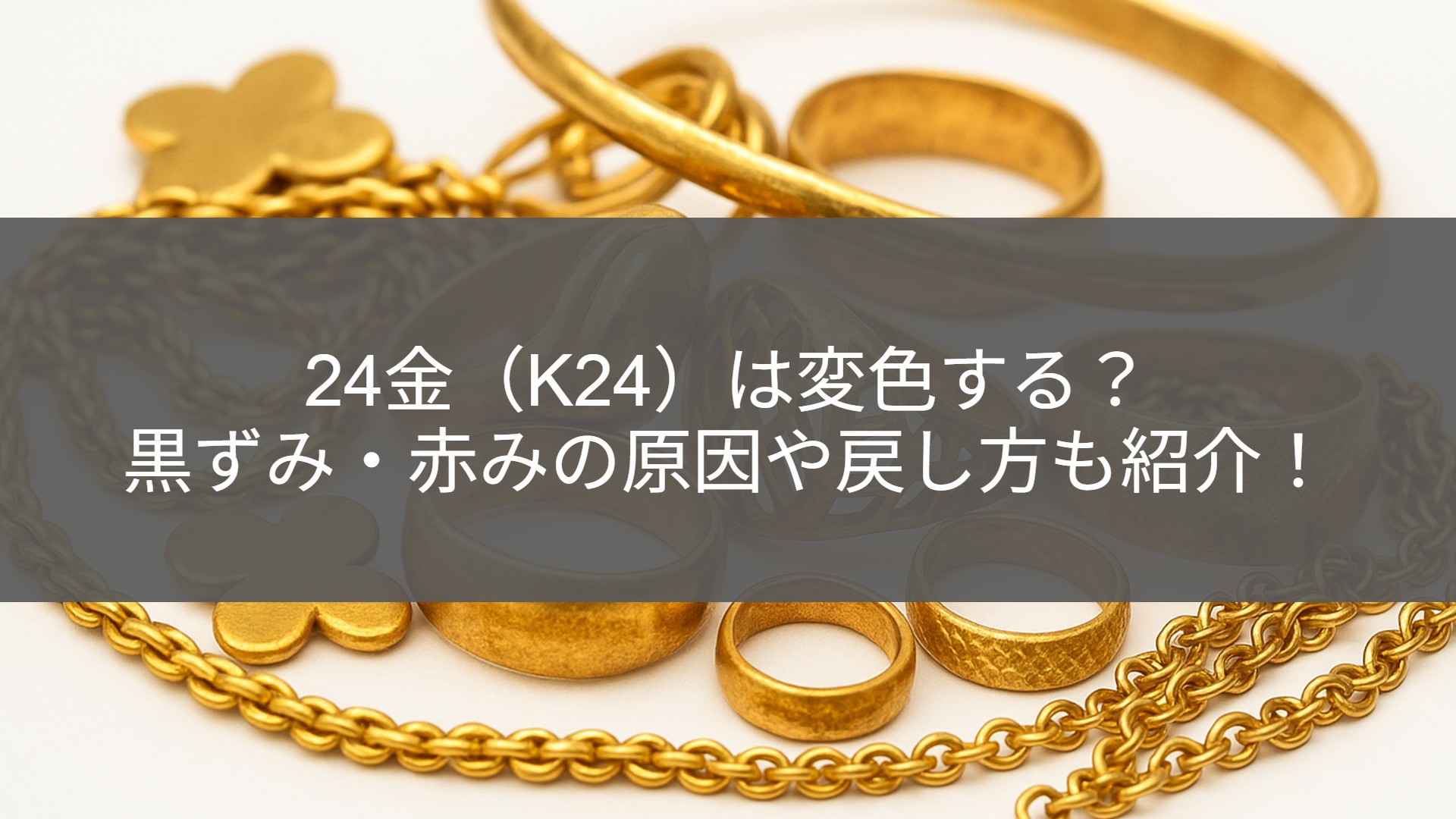 「24金は変色しない」と言われますが、実際には「なんだか黒ずんで見える」「少し赤っぽくなった気がする」と感じたことがある方もいらっしゃるのではないでしょうか? 純度の高い金ほど錆びや変色に強いはずなのに、どうしてそんな変化が起こるのか。もしかすると、思わぬ理由が隠れているかもしれません。 本記事では、24金が変色しにくいとされる理由や、黒ずみが起こる原因、お家でできるお手入れ方法までわかりやすく解説します。ぜひ参考にしてみてください。 1.【純金】24金(K24)は変色しにくい素材 24金(純金)は、金の中でもっとも純度が高く、化学的に非常に安定した金属です。純度99.9%以上を誇るため、酸素や湿気と反応しにくく、酸化や錆びがほとんど起こりません。つまり、日常的な環境であれば変色することはほぼなく、いつまでも美しい輝きを保ちやすい素材といえます。これが「24金は変色しない」と言われる理由です。 ただし、どんな金属でも永遠に完全な状態を保つわけではありません。24金そのものは変質しにくいものの、空気中のホコリや皮脂、化粧品、汗などが表面に付着すると、見た目がくすんでしまうことがあります。そのため「変色した」と感じても、実際は汚れや皮膜による一時的な変化であるケースが多いのです。 また、ジュエリーやコインなどの形状によっては、日々の摩擦で細かな傷がつき、光の反射が鈍くなって色がくすんで見えることもあります。24金は変色に強い素材ですが、扱い方次第で印象が変わる繊細な金属なのです。 2.24金の特徴 24金は「変色しにくい」「錆びにくい」ことで知られる貴金属ですが、その魅力はそれだけではありません。ここでは、知られざる24金の3つの特徴を紹介します。 2-1.耐食性が高く変色しない 24金の最大の特徴は、化学的に安定していることです。純度99.9%以上の金は、空気中の酸素や湿気にさらされても反応しにくく、長期間使用しても酸化や錆びが起こりません。 銀や銅を含む18金や14金と違い、合金による変色の心配がほとんどないのも魅力です。そのため、年月を経ても色味がほとんど変わらず、いつまでも鮮やかな黄金色を保つことができます。資産用のインゴットや記念コインなど、永く美しさを保ちたいアイテムに24金が選ばれるのは、この高い耐食性によるものです。 2-2.柔らかく繊細な質感 純金は非常に柔らかい金属で、指で押すとわずかに跡がつくほどの繊細さがあります。そのため、硬度の高い18金や14金に比べると傷がつきやすく、取り扱いに注意が必要です。 ただし、この柔らかさがあるからこそ、なめらかな輝きと独特の重厚感を生み出します。細かな加工がしやすいため、繊細なデザインの装飾品や彫刻にも適しており、クラフトマンシップが活きる素材としても重宝されています。 2-3.資産価値が高い 24金は、資産としての価値も非常に高い金属です。純度99.9%という高い純度は世界共通の基準で評価され、国や通貨が違っても同じ価値で取引される点が大きな魅力です。 経済の不安定化やインフレなどの影響を受けにくく、「現物資産」として長期的に価値を保ちやすい特徴があります。近年では、世界的な需要の高まりや為替の変動を背景に金相場が上昇傾向にあり、24金の注目度もますます高まっています。そのため、将来的な資産として保有する目的で購入する人も増えています。高い純度ゆえに市場価値が安定している24金は、まさに“手元に置ける確かな資産”といえるでしょう。 24金はこのように純度・安定性・資産価値のいずれを取っても非常に優れた金属ですが、「絶対に変色しない」とは言い切れません。次の章では、24金が変色して見える原因や、赤っぽくなったり黒ずんだりする理由について詳しく見ていきましょう。 3.24金が変色や黒ずんだりする原因 「24金なのに色が変わった」「黒っぽく見える気がする」──そんなときは、まず本当に24金なのかを確認することが大切です。見た目が似ていても、金の純度や構造によって変色の起こりやすさは大きく異なります。 ここでは、24金が変色して見える主な3つの原因を紹介します。 3-1.10金や18金の可能性がある 見た目が金色でも、実際には10金(K10)や18金(K18)といった合金であるケースは少なくありません。これらは金に銀や銅、パラジウムなどを混ぜて強度を高めているため、空気中の酸素や汗の成分と反応しやすく、徐々に赤みを帯びたり黒ずんだりすることがあります。とくに銅を多く含む18金ピンクゴールドなどは、赤茶色の変色が起こりやすい傾向があります。 見た目は24金とほとんど変わらなくても、純度の違いによって耐食性には大きな差が生じます。「24金」と信じていても、刻印を確認すると18金であることに気づくこともあるので、一度チェックしてみるとよいでしょう。 3-2.「GP」や「GF」の刻印がある 金メッキや金張り製品の場合、表面は金色でも中身は別の金属です。たとえば「GP(Gold Plated)」は金メッキ、「GF(Gold 
