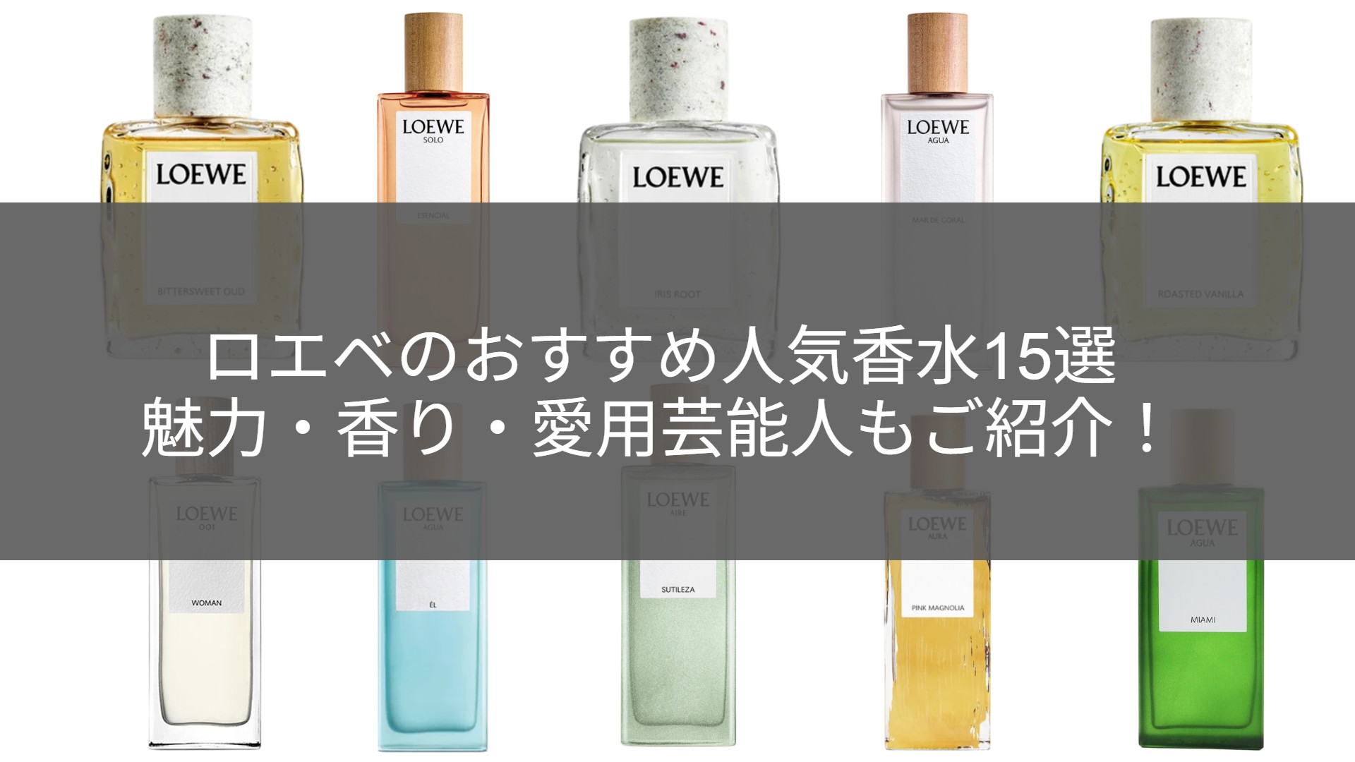 洗練されたデザインと高品質なレザー製品で知られるスペイン発のラグジュアリーブランド、ロエベ(LOEWE)。実は、バッグや財布だけでなく、フレグランスコレクションも豊富に取り扱いがあり、近年で注目を集めています。ハイブランドでありながら日常使いしやすい香りのバランス、ジェンダーレスに使える実用性、そして高級感のあるボトルデザインが人気の理由です。 今回の記事では、ロエベ香水の歴史から魅力、人気香水15選、愛用している芸能人まで徹底解説しています。もし「ロエベの香水が気になっている」「ロエベで香水を探している」なら、ぜひ本記事を参考になさってください。 1.ロエベ(LOEWE)香水の歴史 出典:LOEWE Perfumes ロエベの香水は、革製品で培った感性を香りへと昇華させながら進化してきました。誕生から現在まで、ブランドの世界観と密接に関わりながら多くの名作が生まれています。ここでは、ロエベ香水がどのように形づくられてきたのか、歴史をたどります。 1-1.香水事業への参入 ロエベは1846年にスペイン・マドリードで誕生した老舗の革製品ブランド。現在では、「アマソナ」「パズルバッグ」などのアイコニックなバッグや革小物を始め、洋服や靴などのプレタポルテコレクションも人気を博しています。 香水の分野へ本格参入したのは、1970年代前半のこと。1972年にロエベは、ブランド初となるウィメンズフレグランス「L de Loewe」を発表しました。 「L de Loewe」は、ガルバナムやネロリによる鮮やかなグリーンのトップから始まり、ヒヤシンスやスズランが重なるクラシックなフローラルへと移ろう香り。ラストはレザーやオークモスが深みを与える、上質なグリーン・シプレー調が特徴で、当時のヨーロッパで高い評価を得ました。革の香りを想起させるようなレザーのニュアンスは、まさにロエベらしさを象徴しています。 これを機に、ロエベはフレグランス分野を本格的に拡大し、のちの「ソロ」や「アグア」などの人気シリーズへと繋がっていきます。 ロエベの香水は、レザー製品で培ったクラフトマンシップの精神を受け継ぎ、自然・アート・ボタニカルをキーワードに独自の世界観を構築してきました。 1-2.フレグランスラインの拡大 1970年代の香水事業参入後、ロエベは時代に合わせて独自のフレグランスラインを次々と拡大していきました。 1985年に登場した「アイレ(Aire)」は、清潔感と透明感を重視したフレッシュフローラルの香りで、ロエベ=軽やかで爽やかな香りというイメージを確立させました。 続く1987年の「エッセンシア・デ・ロエベ」は、スパイスとウッドが重なるエレガントで深みのある香りで、クラシックな男性像を体現するロングセラーに。 2004年には、香りのレイヤーが調和するバランスをテーマにした「ソロ(Solo)」が登場。知的でミニマルな香り構成が支持され、ブランドを代表する香りに。 そして2009年、自然の清らかさをボトルに閉じ込めたような「アグア(Agua)」シリーズが誕生。軽やかでみずみずしい香りは現代的な感性にマッチし、ユニセックスフレグランスの人気を後押ししました。 これらの名作を通してロエベは、クラシックからモダンまで幅広い香り表現を確立し、ブランドとしてのフレグランス領域を大きく広げていきます。 1-3.リニューアルによってさらに人気に 2013年にジョナサン・アンダーソンがクリエイティブ・ディレクターに就任して以降、ロエベのフレグランスは大きな転換期を迎えます。ブランドのビジュアルやロゴ、ボトルデザインが大胆にリニューアルされ、モダンアートのようなデザインに。若い世代を中心に一気に認知が広がりました。 その象徴的存在が2016年に登場した「001」シリーズ。ウーマンとマンの2本が補い合うように作られた香りは、ミニマルで清潔感がありながら、肌に溶け込むようなニュアンスが特徴。ジェンダーレスな時代性とも重なり、ロエベ香水の新たな代表作として人気を確立しました。 2021年には「ボタニカルレインボー」コレクションを発表。自然からインスピレーションを得た、「アグア(Agua)」や「ソロ(Solo)」など、全9種のフレグランス・ファミリーから成るコレクションです。名前のとおり、虹のようなカラフルなボトルが印象的なフレグランスラインで、ロエベが掲げる「自然との調和」というテーマを視覚的に表現したもの。色鮮やかなボトルとユニセックスな香りがブランドの新しい象徴として世界中で人気を集めています。 こうしたリニューアルにより、ロエベの香水はクラシックな名作を持ちながら、今もっとも勢いのあるラグジュアリーフレグランスとして再評価される存在となりました。 2.ロエベ香水の特徴や魅力 出典:LOEWE Perfumes ロエベの香水は、ほかにはない「自然」と「アート」の共存が魅力です。香りの構成だけでなく、ボトルやコンセプトにもブランド哲学が反映されています。ここでは、ロエベの香水の特徴や魅力について解説します。 2-1.ロエベ専属の