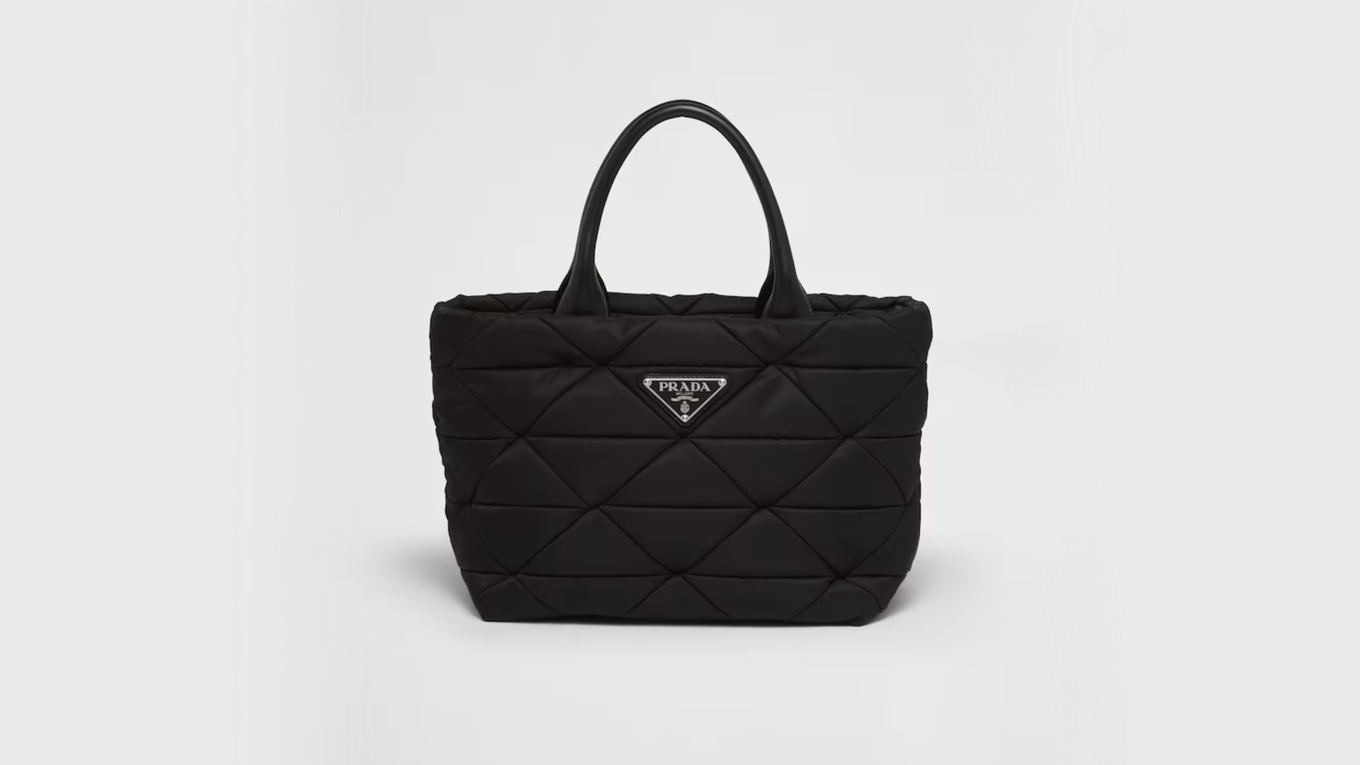 Re-Nylonに、ふっくらとしたパデッド加工を施したこのトートバッグは、軽快さと洗練された佇まいを兼ね備えた名品です。Re-Nylon素材は非常に軽量でありながら、シルクのような上品な光沢を放ち、中央のエナメルメタルの三角ロゴが気品を添えています。