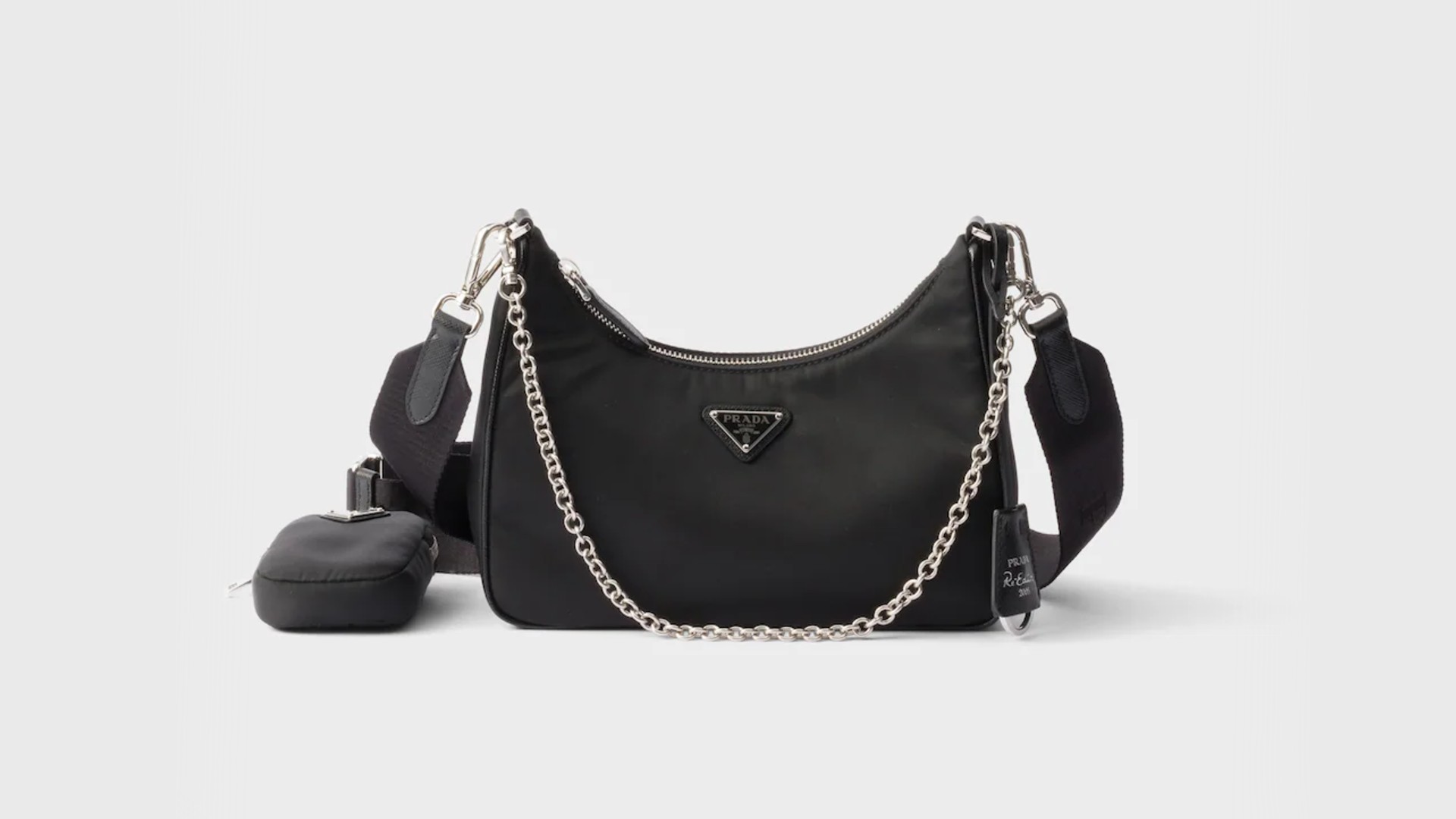 2000年代のアーカイブデザインを現代的にアップデートし、SNSを中心に再ブームを巻き起こしているのが「Re-Edition 2005」です。幅22cm、高さ18cmというコンパクトなホーボーバッグに、チェーンハンドルや取り外し可能なロゴ入りショルダーストラップ、さらにはミニポーチまでがセットになった多機能な設計が特徴です。