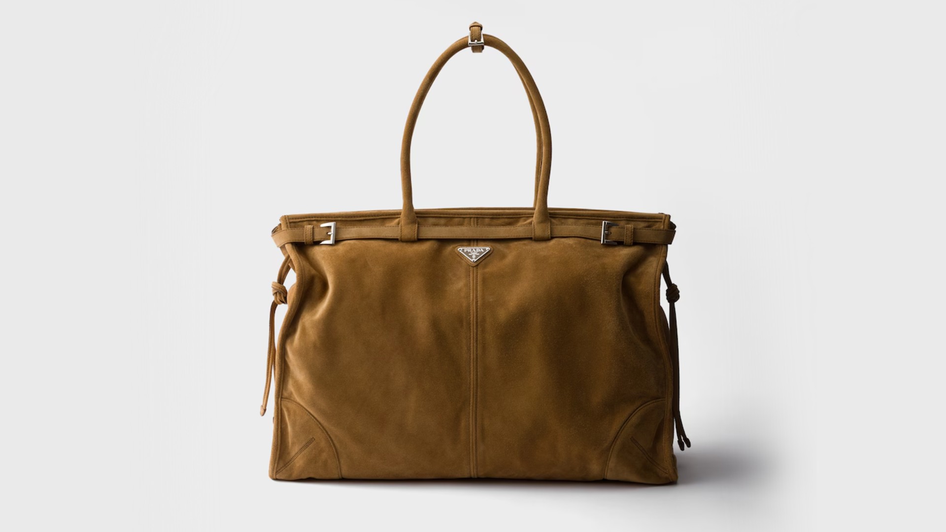 温かみのある柔らかな質感のスエードを贅沢に使用しており、裏地にはロゴプリント入りRe-Nylonとナッパレザーが採用されています。50cmという幅の広さでマチが17cmある大型のサイズ感は、ノートPCや仕事の書類を収納できます。