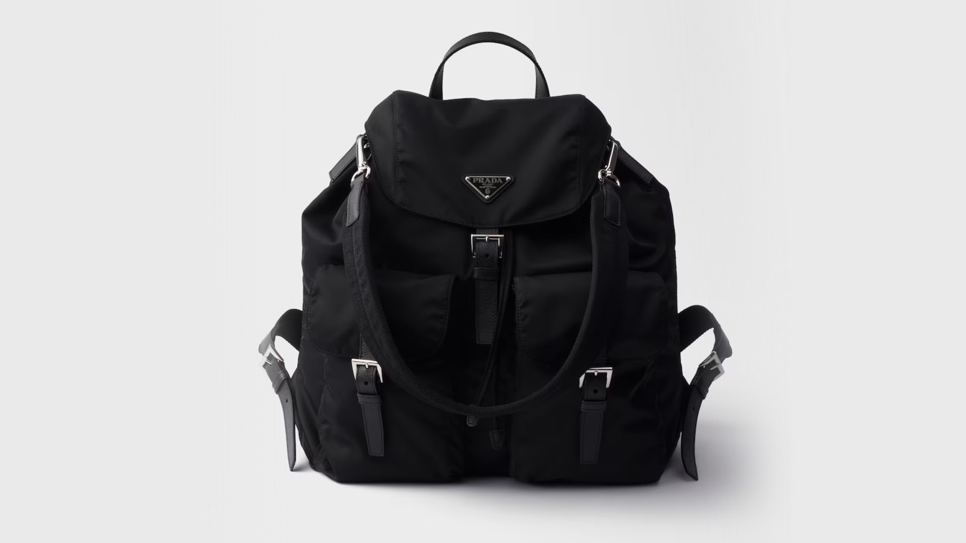 プラダのナイロンバッグの中でも、1984年の登場以来、不朽の名作として愛され続けているのがバックパックです。ミニマルなフォルムに、アイコニックな2つのフロントポケットとエナメルメタルの三角ロゴを配したデザインは、バックパックという実用的なアイテムに洗練された気品を与えました。