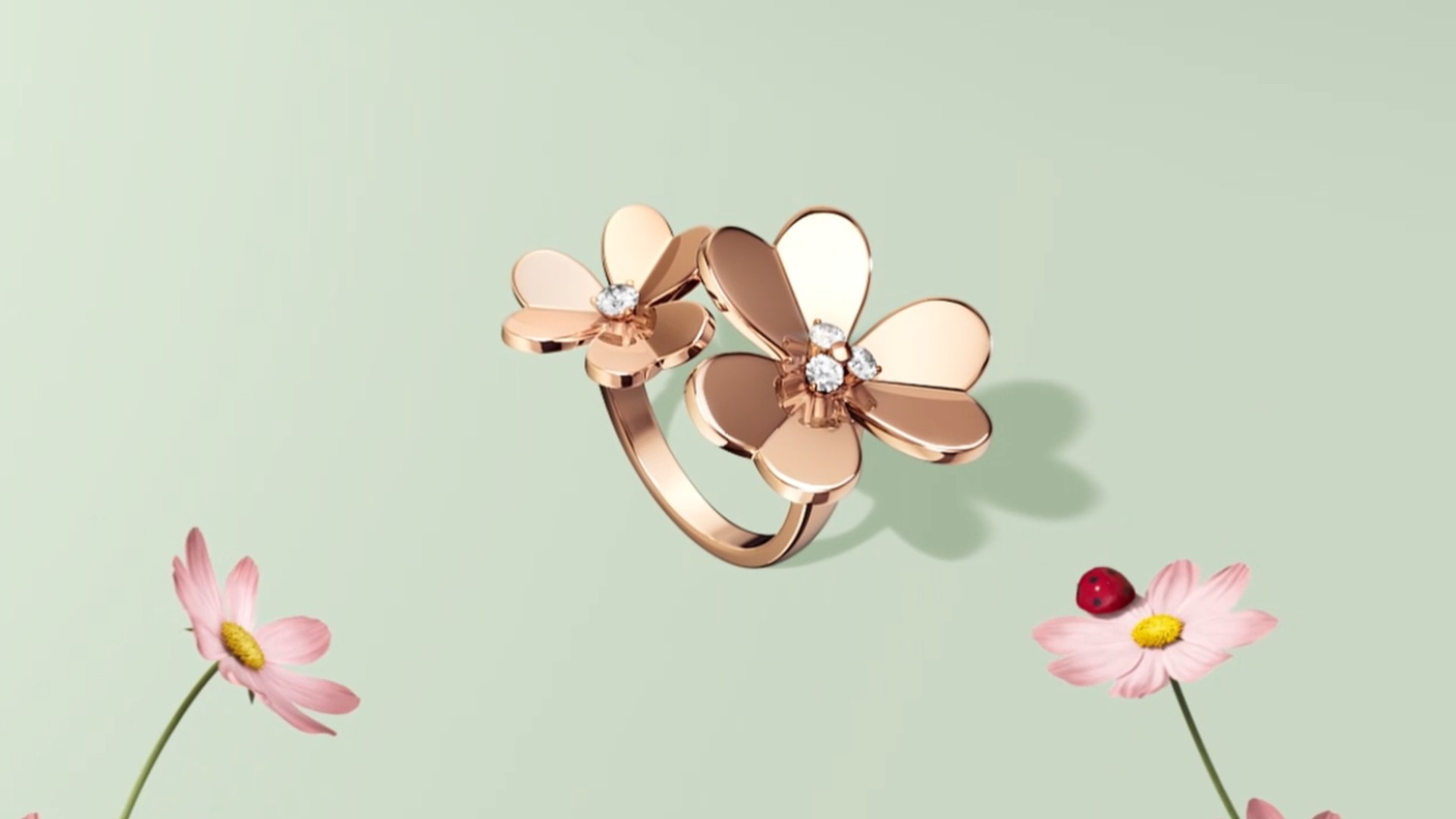 ヴァンクリーフ&アーペルの「フリヴォル」は、そよ風に揺れる花々をイメージしたコレクションです。立体感のあるハート型の花びらが特徴で、鏡面仕上げのゴールドとダイヤモンドが光を反射し、繊細で軽やかな輝きを放ちます。