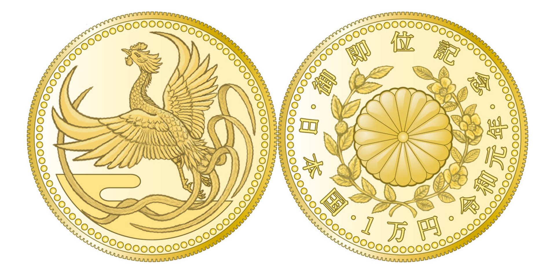 金貨の表面には瑞雲がたなびく天空に舞う鳳凰が描かれ、裏面には菊花紋章が刻まれています。昭和と平成の金貨よりも発行枚数が圧倒的に少なく、抽選販売で取引されたため希少性が高いです。