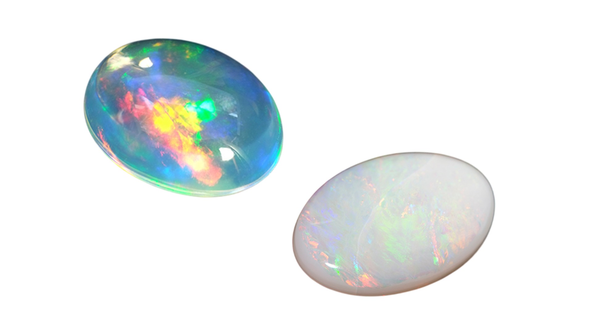 オパールは水面のような揺らめく光を放つ、美しく幻想的な宝石です。中でも地色が透明で水滴のように見えるものをウォーターオパール、乳白色のものをホワイトオパールと呼びます。ウォーターオパールは透き通るような透明感が魅力で、光を受けると水面に光が反射するような輝きを見せます。遊色効果(プレイ・オブ・カラー)がないタイプでも、その柔らかな質感が魅力的です。一方、ホワイトオパールは半透明から不透明の優しい白色が特徴で、虹色の遊色効果が際立ちます。特にこの光の揺らめきが美しいものほど価値が高いとされています。