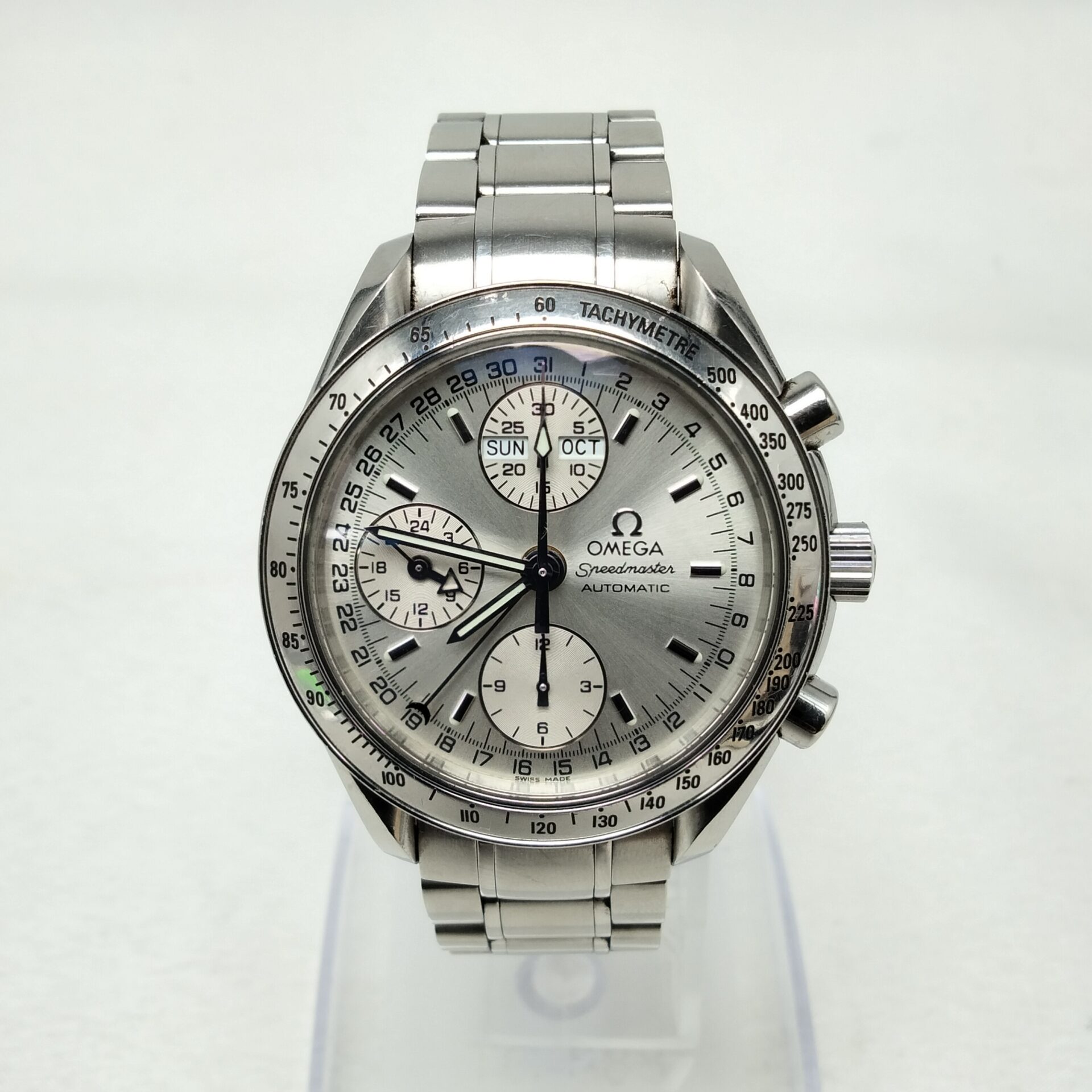 オメガのスピードマスター リデュースド(型番:3539.50)をお買取りさせていただきました。ブランド買取店「ESTIME/エステメ」では、オメガ スピードマスターシリーズをはじめ、高級時計の買取を強化しています。査定では、ケースやブレスレットのキズや擦れ、風防の状態、クロノグラフ機能の動作、リューズやプッシュボタンの作動確認、ムーブメントの精度などを丁寧に確認しました。スピードマスターリデュースドは、コンパクトなサイズ感と使いやすさから根強い人気があり、コンディションや付属品の有無によって高価買取が期待できます。