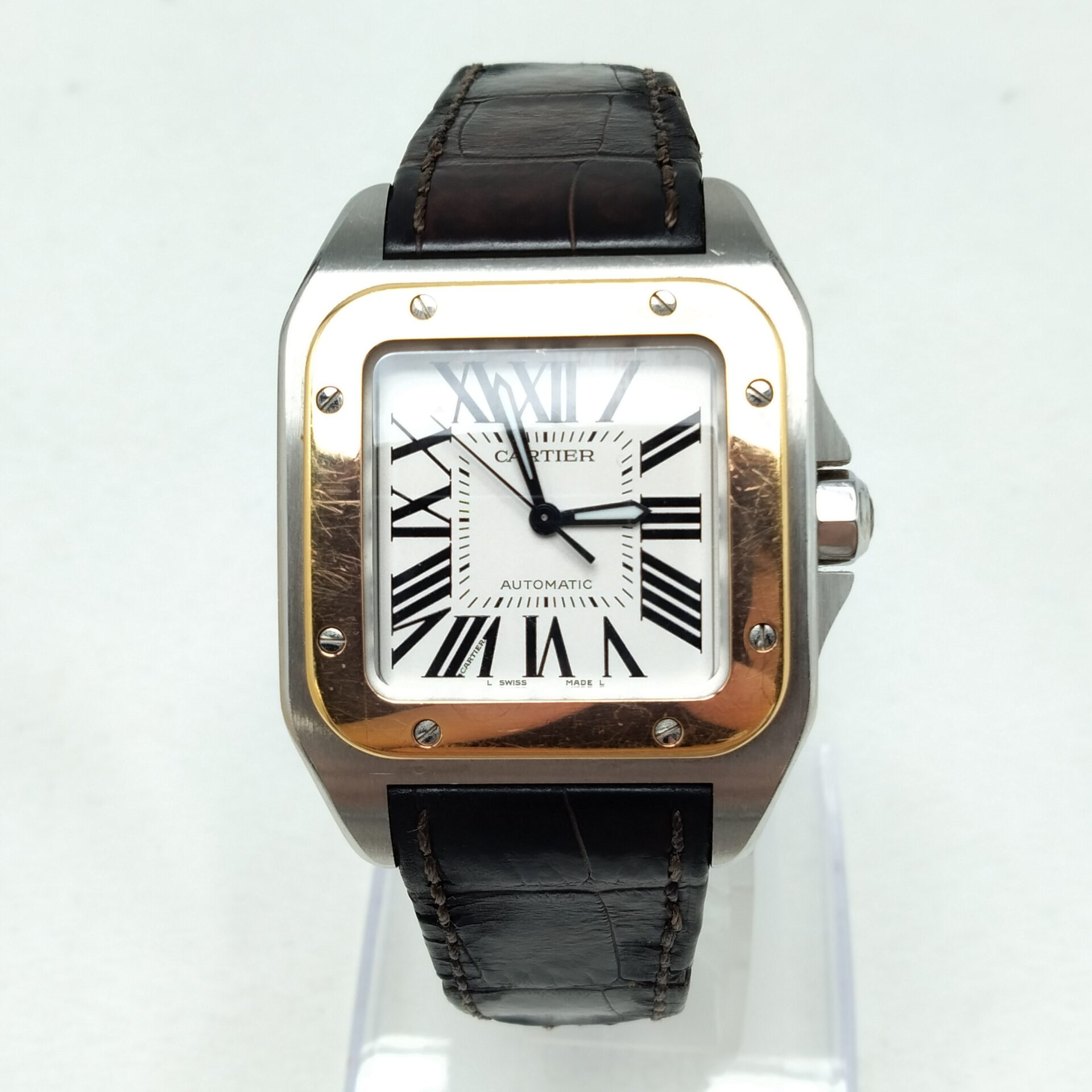カルティエのサントス100 W20107X7をお買取りさせていただきました。ブランド買取店「ESTIME/エステメ」では、カルティエの時計買取を強化しています。査定では、ケースやベゼルの小キズ、ガラスの擦れ、リューズや針の動作、ブレスレットまたはストラップの使用感を丁寧に確認しました。また、付属品の有無やメンテナンス履歴も査定額に大きく影響します。サントスはカルティエを代表する人気コレクションであり、特に存在感のあるサントス100は需要が高いため、良好な状態であれば高価買取が期待できます。