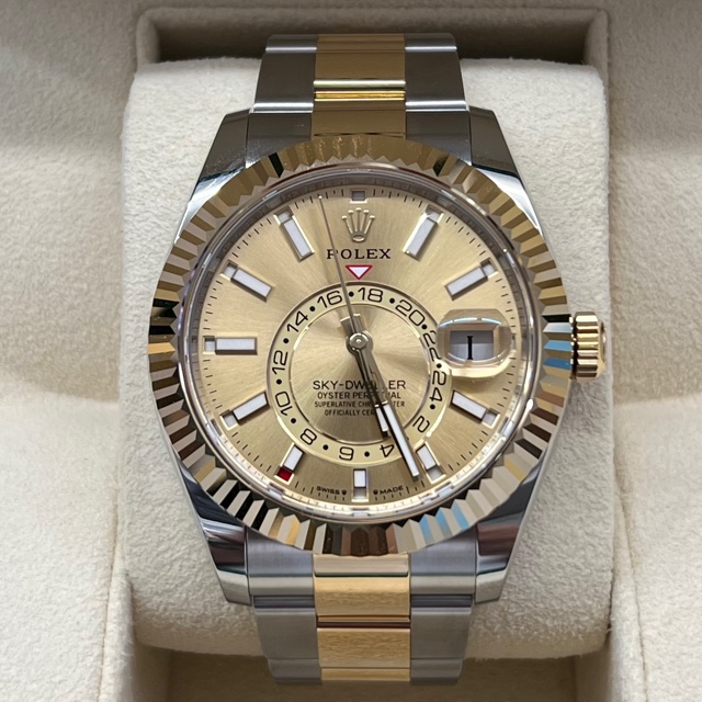 2023年に誕生したモデルの『ロレックス スカイドゥエラー Ref.336933』。イエローロレゾールで作られたコンビモデルです。スカイドゥエラーはロレックス唯一の複雑機構搭載モデルとして知られており、高級感とロレックスの高い技術力を感じることができます。また、中古市場でも人気なモデルとなっておりますので買取金額が高値となるケースが多いです。お持ちの方はぜひ弊社エステメまでお持ち込みくださいませ。