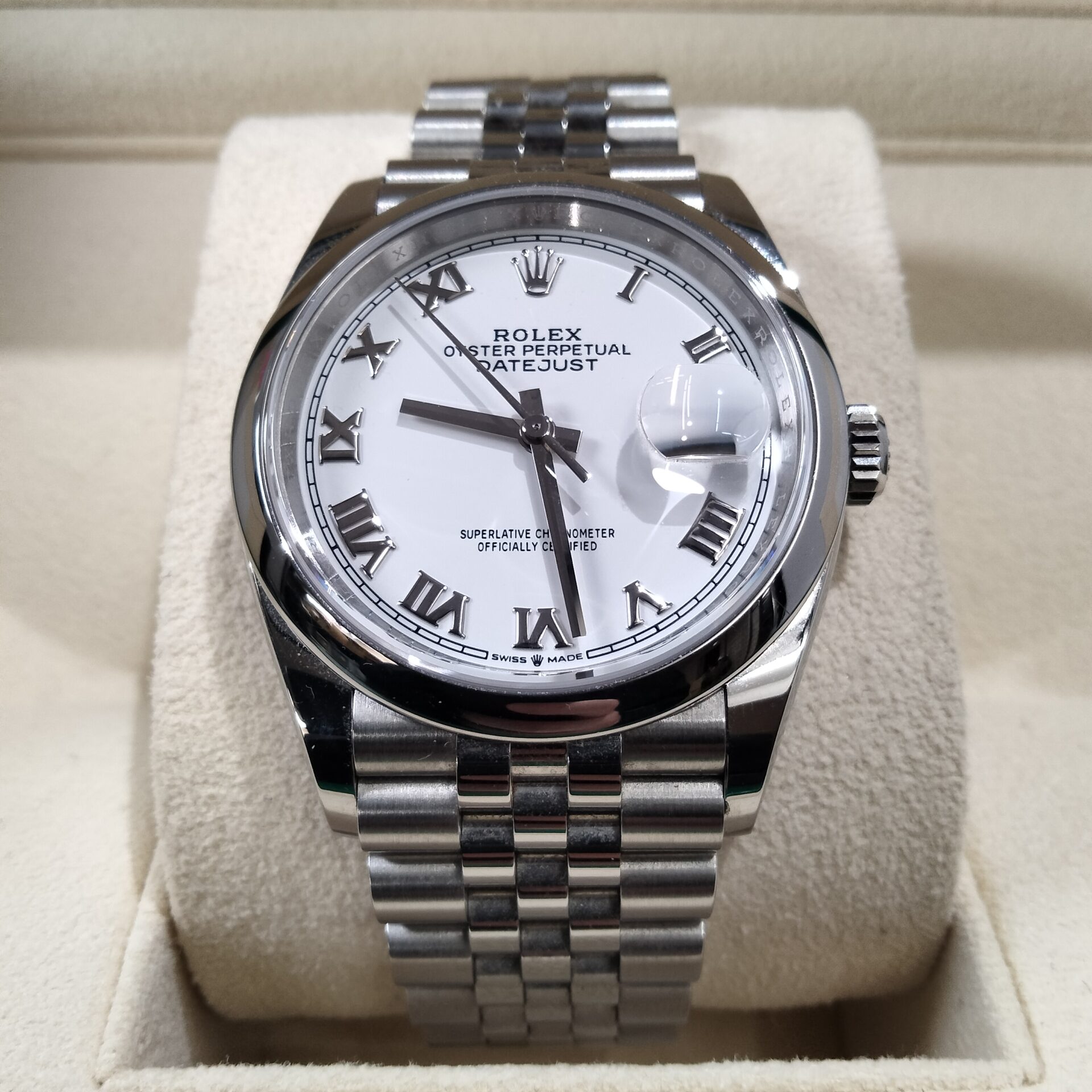 査定ではケースやブレスレットのキズの有無、風防の状態、リューズやデイトの動作状況が評価の中心となります。126200はステンレス製デイトジャストで、白ローマ文字盤とジュビリーブレスの組み合わせは上品で人気の高い仕様です。特にインデックスや針の劣化がないか、ジュビリーブレスの伸びやヨレ具合も細かくチェックされます。ギャランティや外箱・内箱など付属品の有無も査定額に影響し、状態が良好であれば高価買取が期待できます。