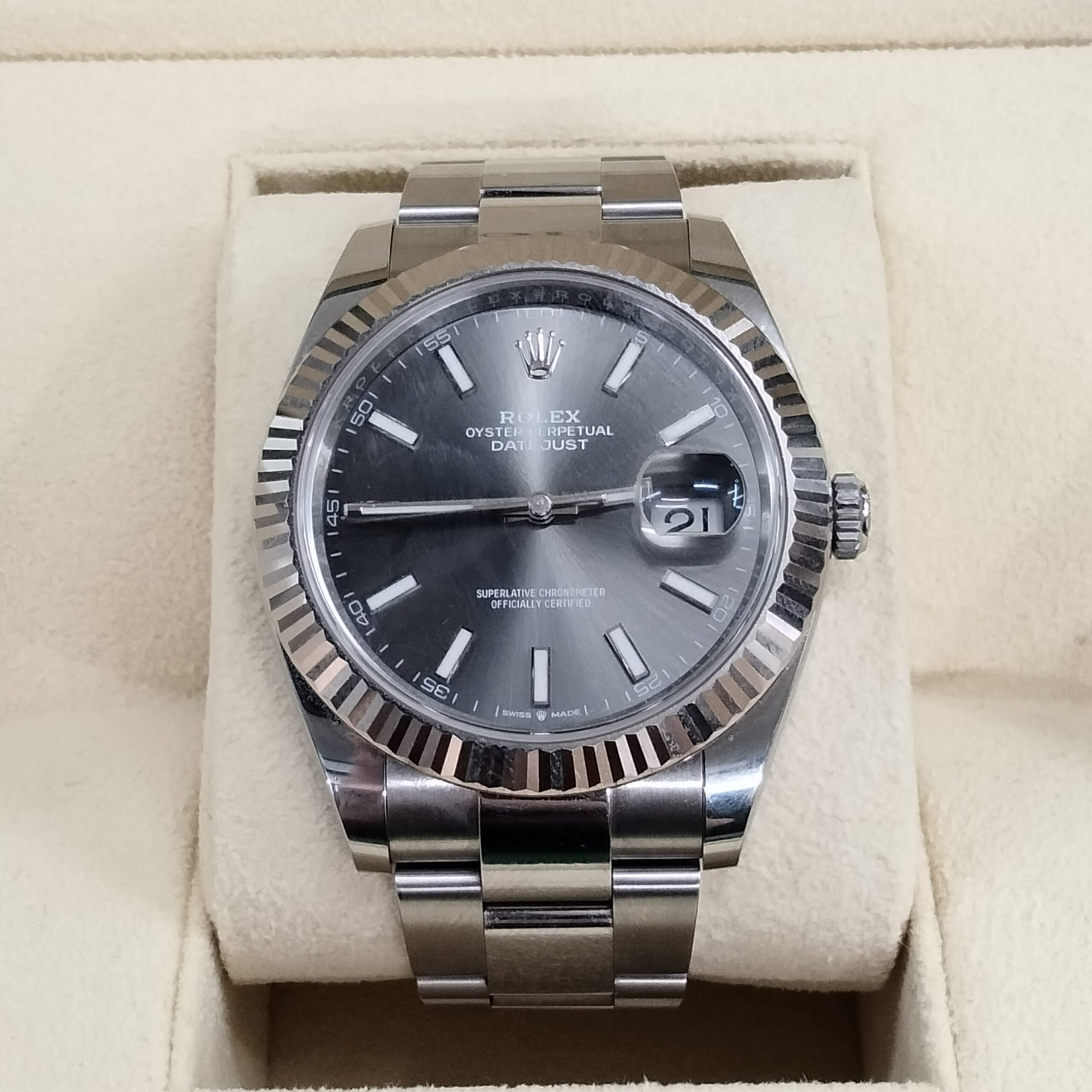 ロレックス デイトジャスト 126334 オイスターブレスレット スレートバー文字盤 をお買取りさせていただきました。ブランド買取店「ESTIME/エステメ」では、ロレックスをはじめとする高級時計の買取を強化しています。本モデルの査定では、ケースやベゼルのキズ、風防や文字盤の状態、ムーブメントの精度、リューズやカレンダー機能の動作、ブレスレットの使用感や伸び、付属品の有無などが買取価格に影響します。中でもスレートグレーのバーインデックス文字盤は落ち着いた雰囲気で人気が高く、状態や付属品が揃っている個体は高価買取が期待できます。