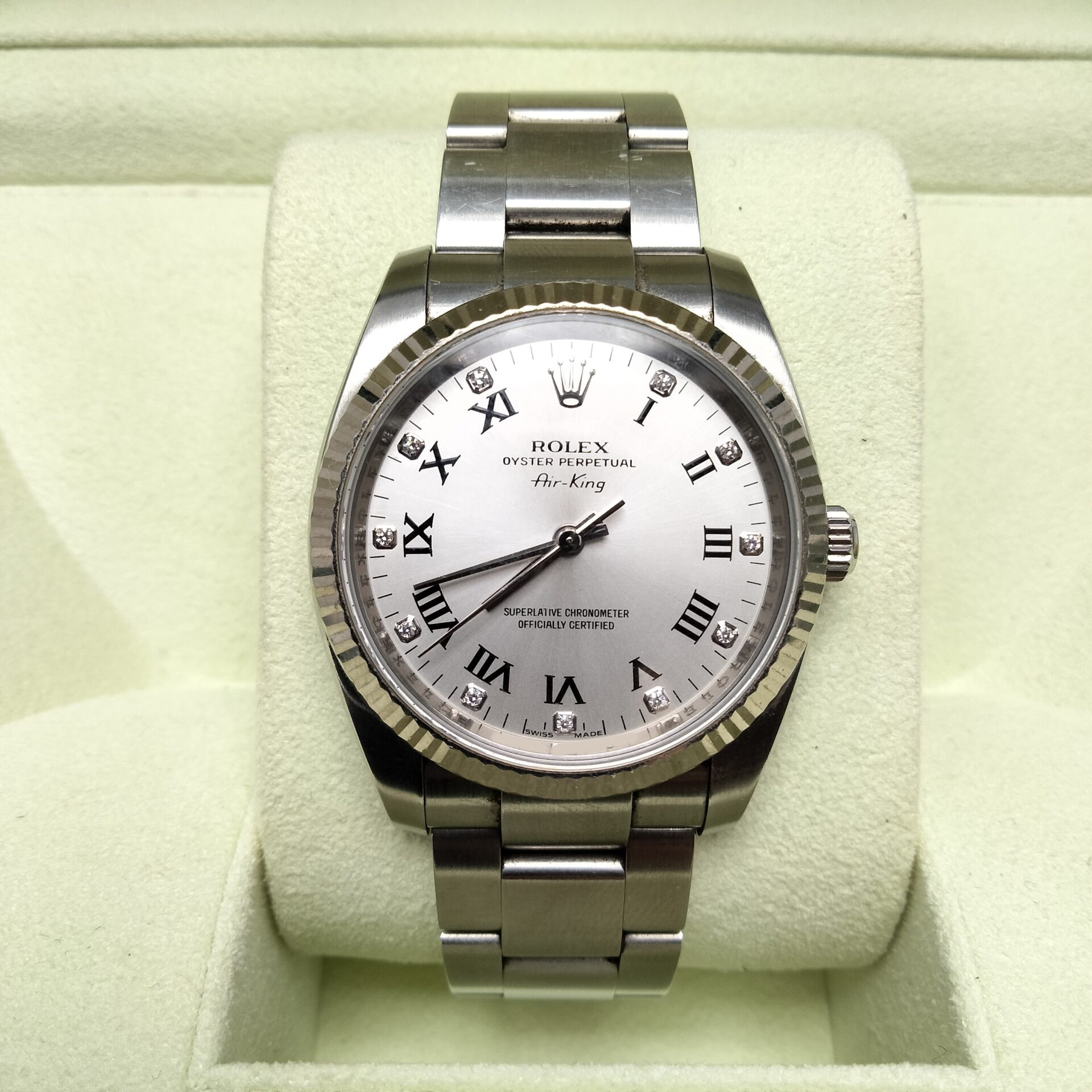 ロレックス エアキング 114234G シルバー文字盤 をお買取りいたしました。査定では、ケースのキズの有無、風防のコンディション、ムーブメントの動作状況、ブレスレットや留め具の確認、付属品の有無、全体の使用感を確認しました。状態が良好な場合は高価買取が期待できます。
