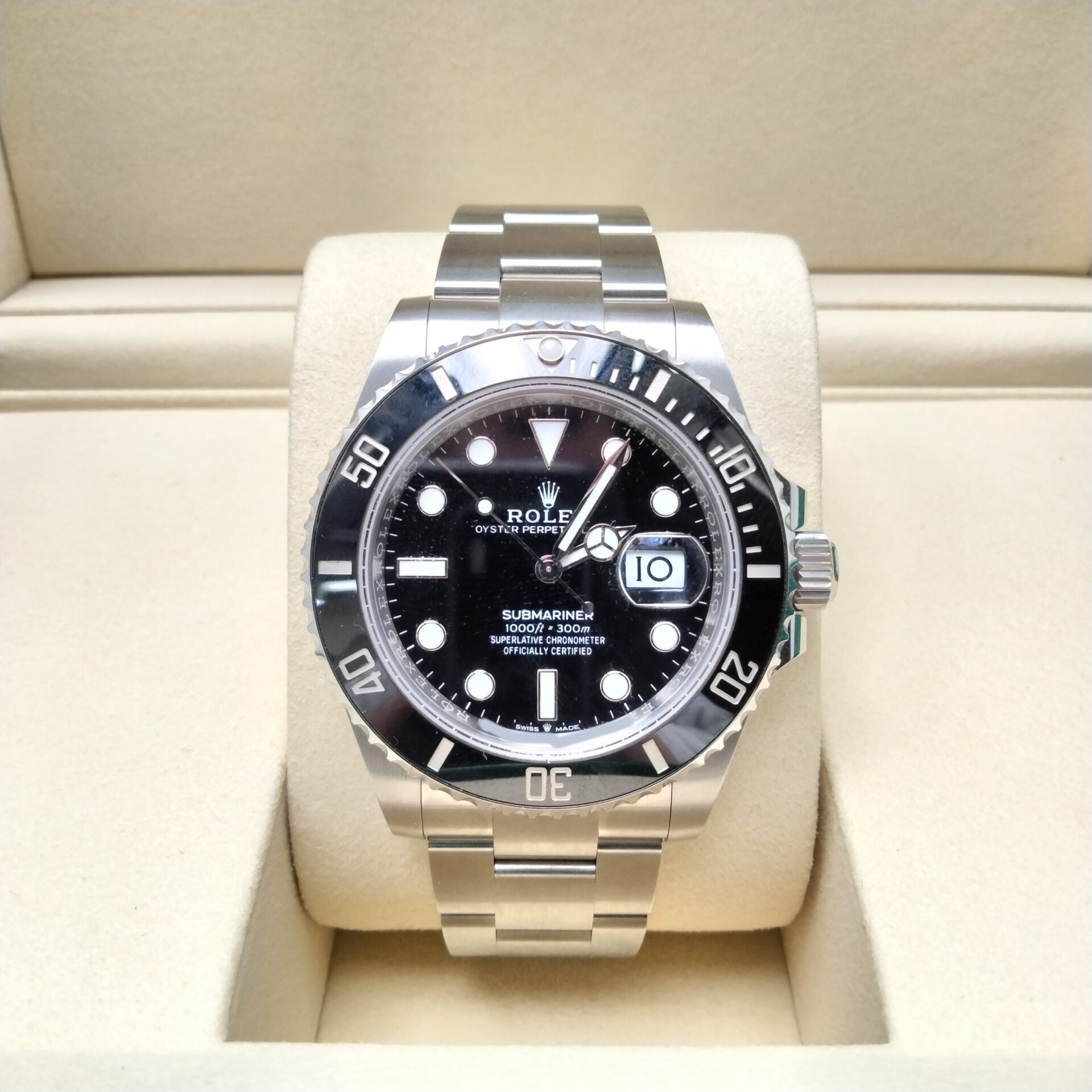 ロレックス サブマリーナー 126610LN をお買取りいたしました。査定では、ケースのキズの有無、風防のコンディション、文字盤や針の確認、回転ベゼルの動作確認、ムーブメントの動作状況、ブレスレットや留め具の確認、付属品の有無、全体の使用感を確認しました。状態が良好な場合は高価買取が期待できます。
