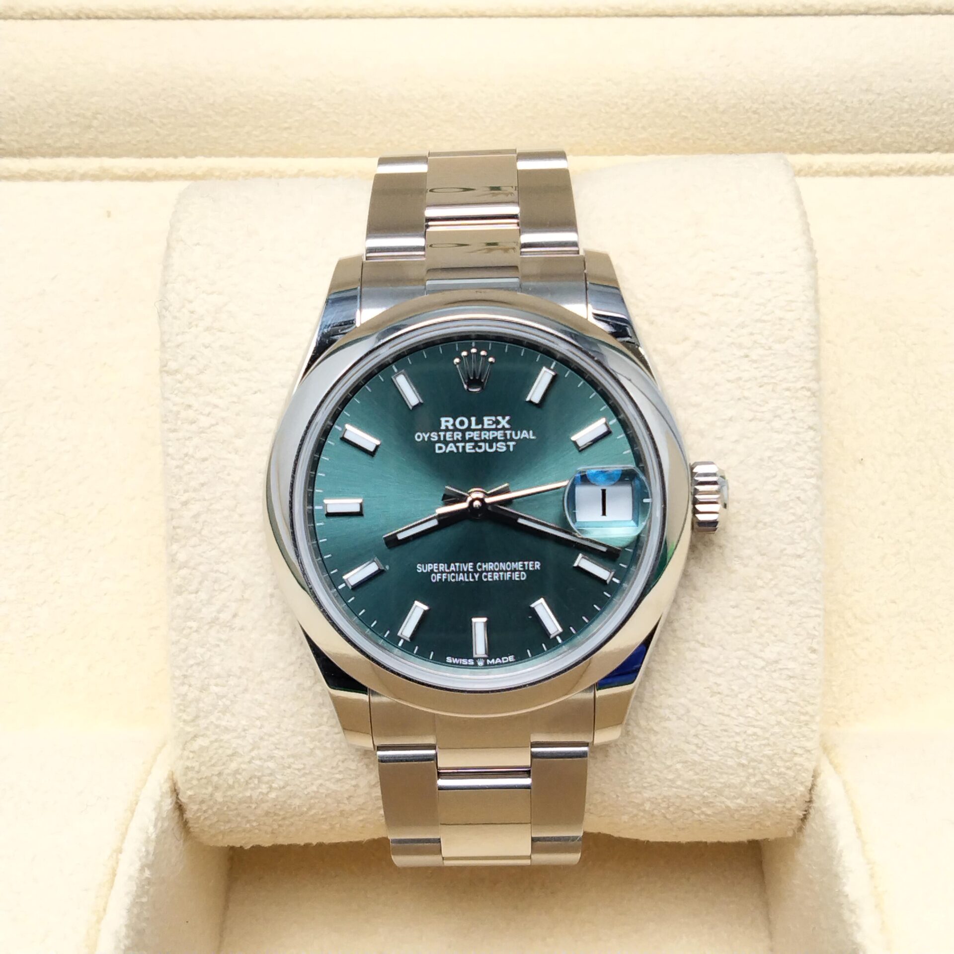 ロレックス デイトジャスト 278240 ミントグリーン文字盤 オイスターブレス をお買取りいたしました。査定では、ケースのキズの有無、風防のコンディション、文字盤や針の確認、ムーブメントの動作状況、ブレスレットや留め具の確認、付属品の有無、全体の使用感を確認しました。状態が良好な場合は高価買取が期待できます。