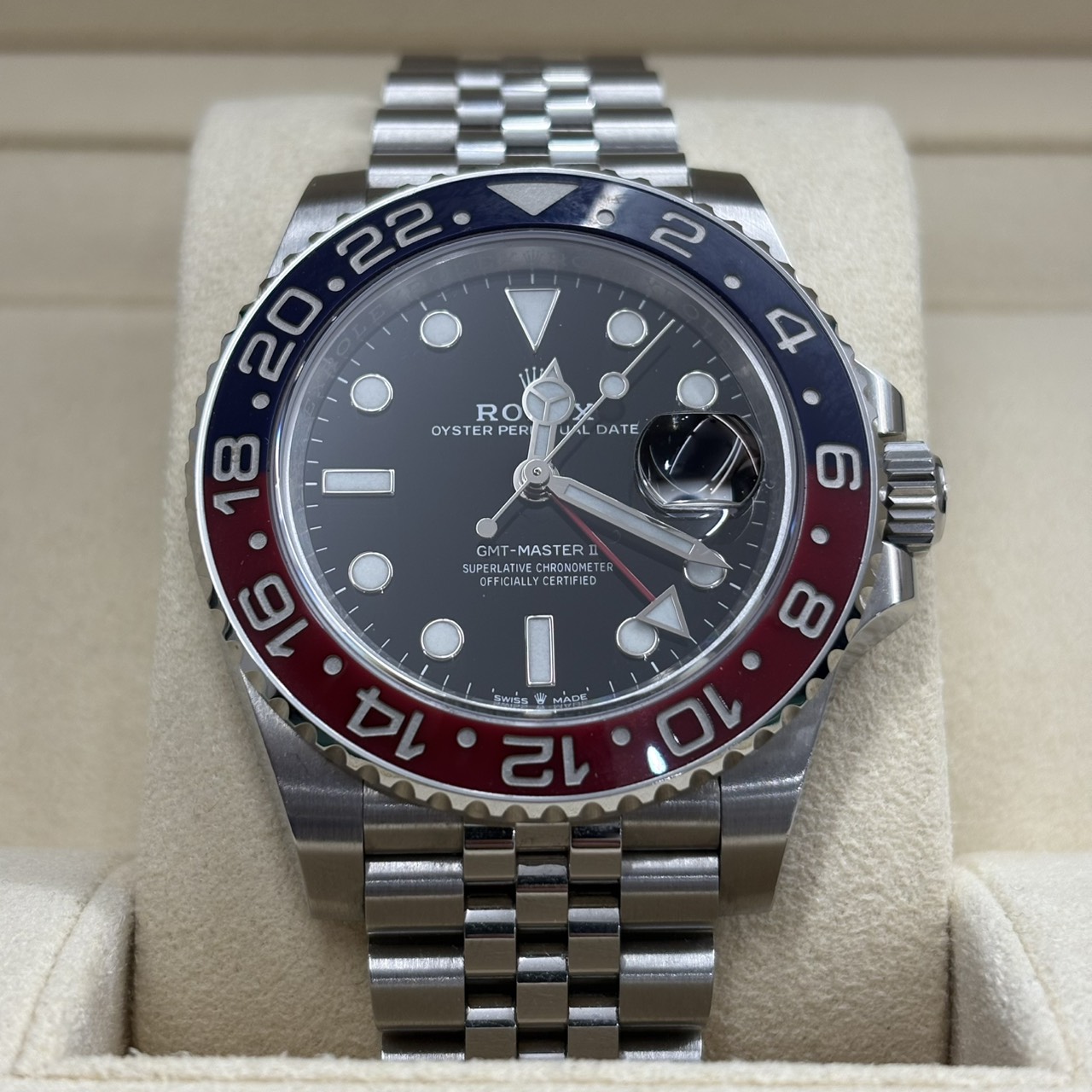 ロレックス GMTマスターⅡ 126710BLRO ジュビリー をお買取りいたしました。査定では、ケースのキズの有無、風防のコンディション、文字盤や針の確認、ベゼル、ムーブメントの動作状況、ジュビリーブレスや留め具の確認、付属品の有無、全体の使用感を確認しました。状態が良好な場合は高価買取が期待できます。