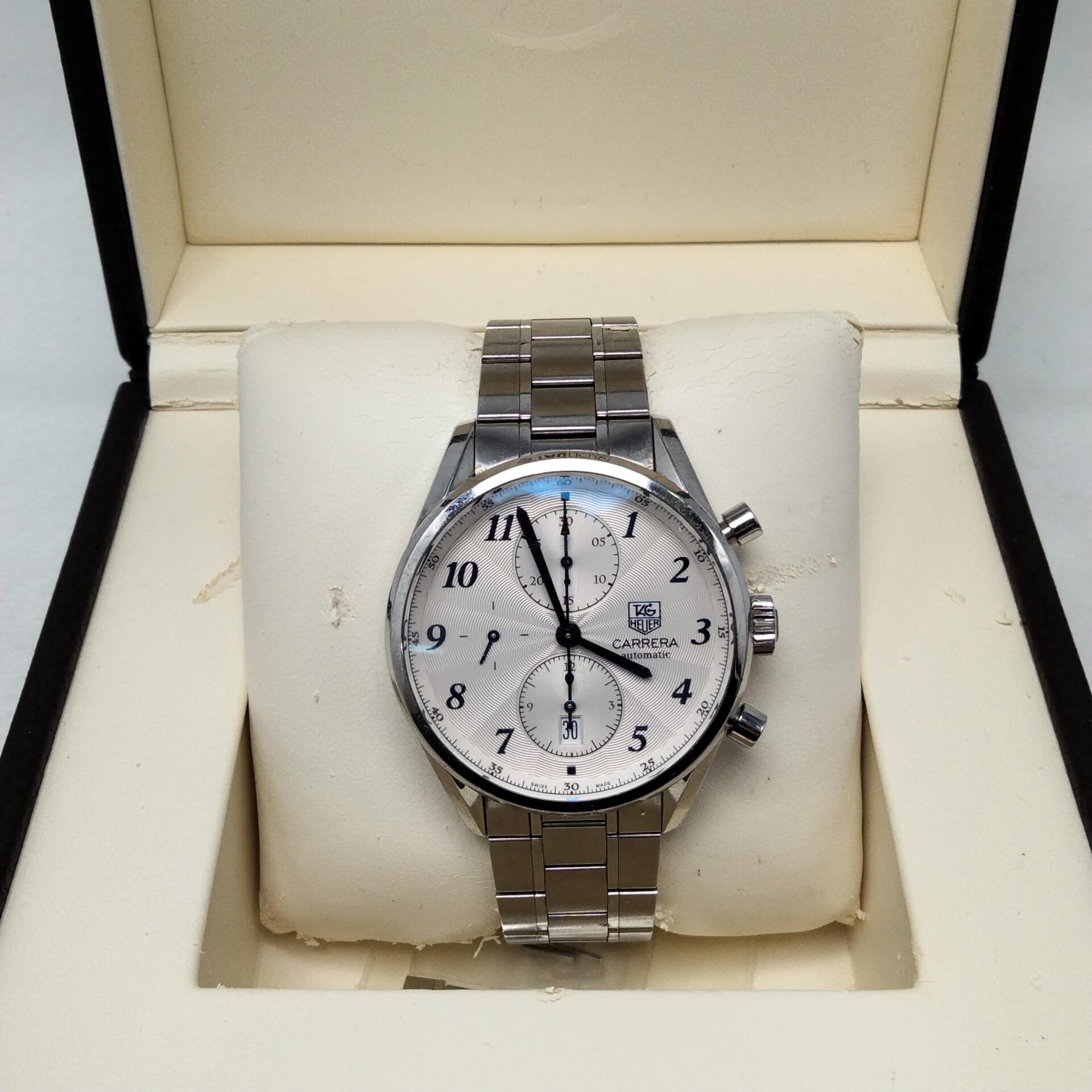 タグホイヤー カレラ CAS2111 シルバー文字盤をお買取りいたしました。査定では、ケースやブレスレットの状態、スレ・キズの有無、シルバー文字盤や針のコンディション、クロノグラフ機能の動作状況、ベゼル周りの状態、バックルの状態、付属品の有無、全体の使用感を確認しています。カレラはタグホイヤーを代表する定番シリーズのため、状態が良好な場合は高価買取が期待できます。